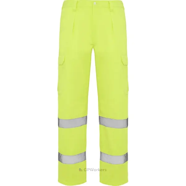 Pantalon haute visibilité jaune fluorescent.· Ceinture ajustable avec élastique dans le dos.· Deux poches avant.· Poche fonctionnelle avec rabat et fermeture velcro.· Deux poches latérales à soufflet et rabat avec velcro.· Deux bandes réfléchissantes horizontales.