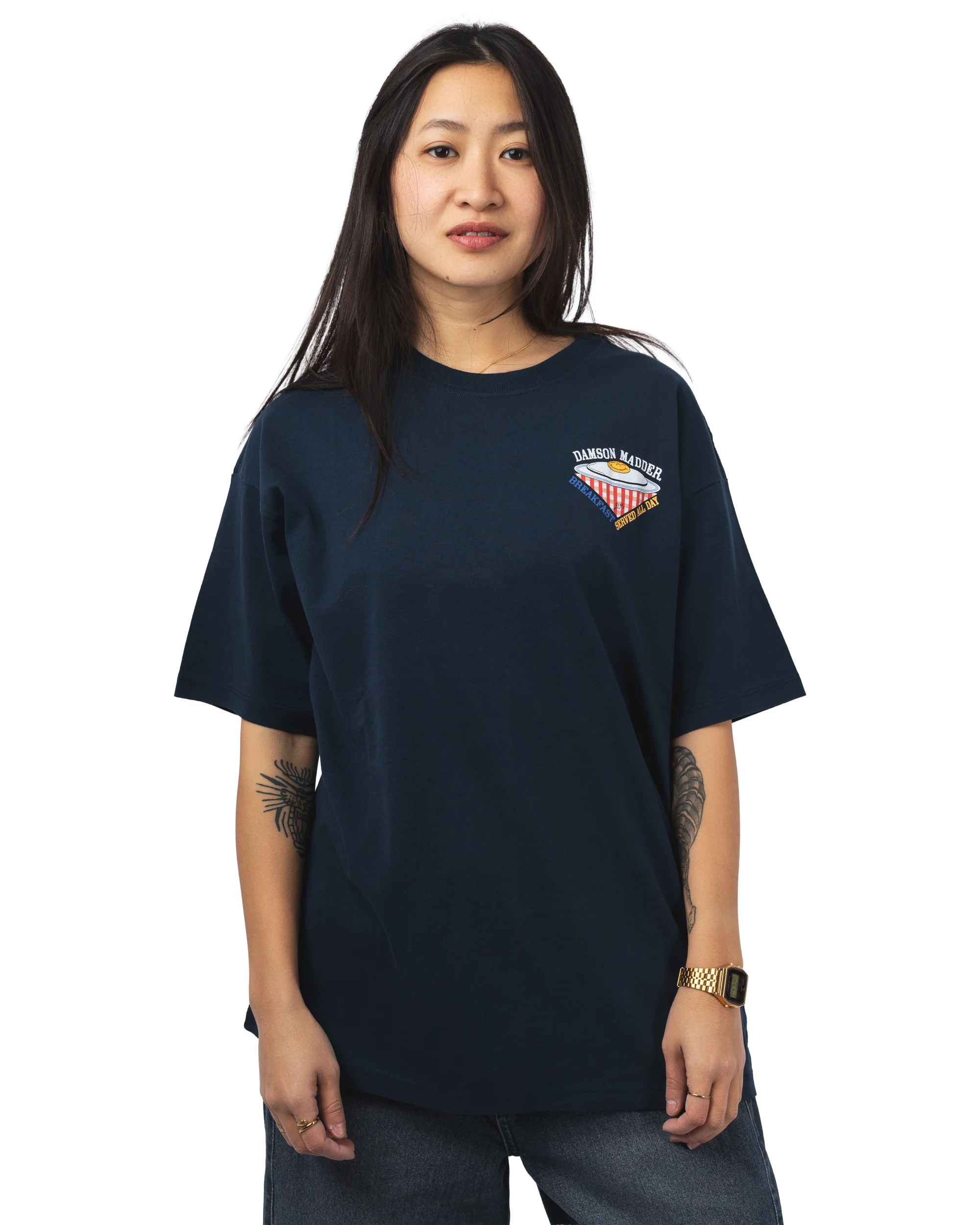 Le All Day Breakfast Tee illustre parfaitement cet esprit. Confectionné en coton doux et confortable, il offre un porté agréable au quotidien. Sa coupe droite assure une silhouette décontractée et facile à associer, tandis que les finitions soignées renforcent son caractère essentiel. Le motif graphique « All Day Breakfast », à la fois ludique et expressif, apporte une touche décalée fidèle à l’identité créative de la marque.