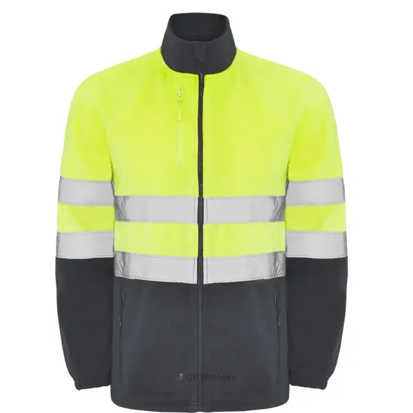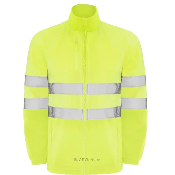 Veste style polaire haute visibilité.· Fermeture à glissière avant avec protège-menton.· Deux bandes réfléchissantes horizontales sur le torse et les manches.· Deux poches avant zippées ton sur ton et une poche poitrine.· Poignets élastiques et ajusteurs à l’intérieur de l’ourlet.