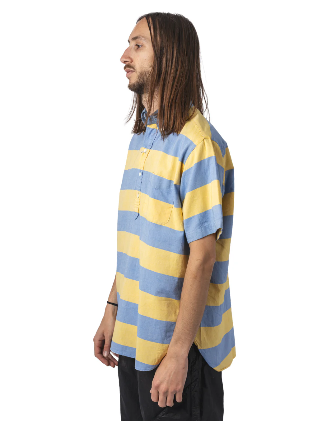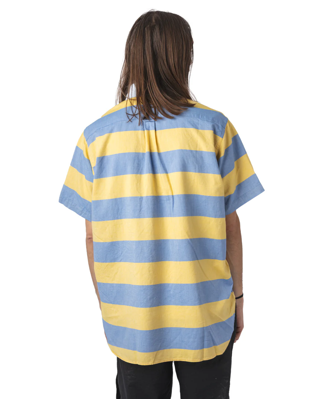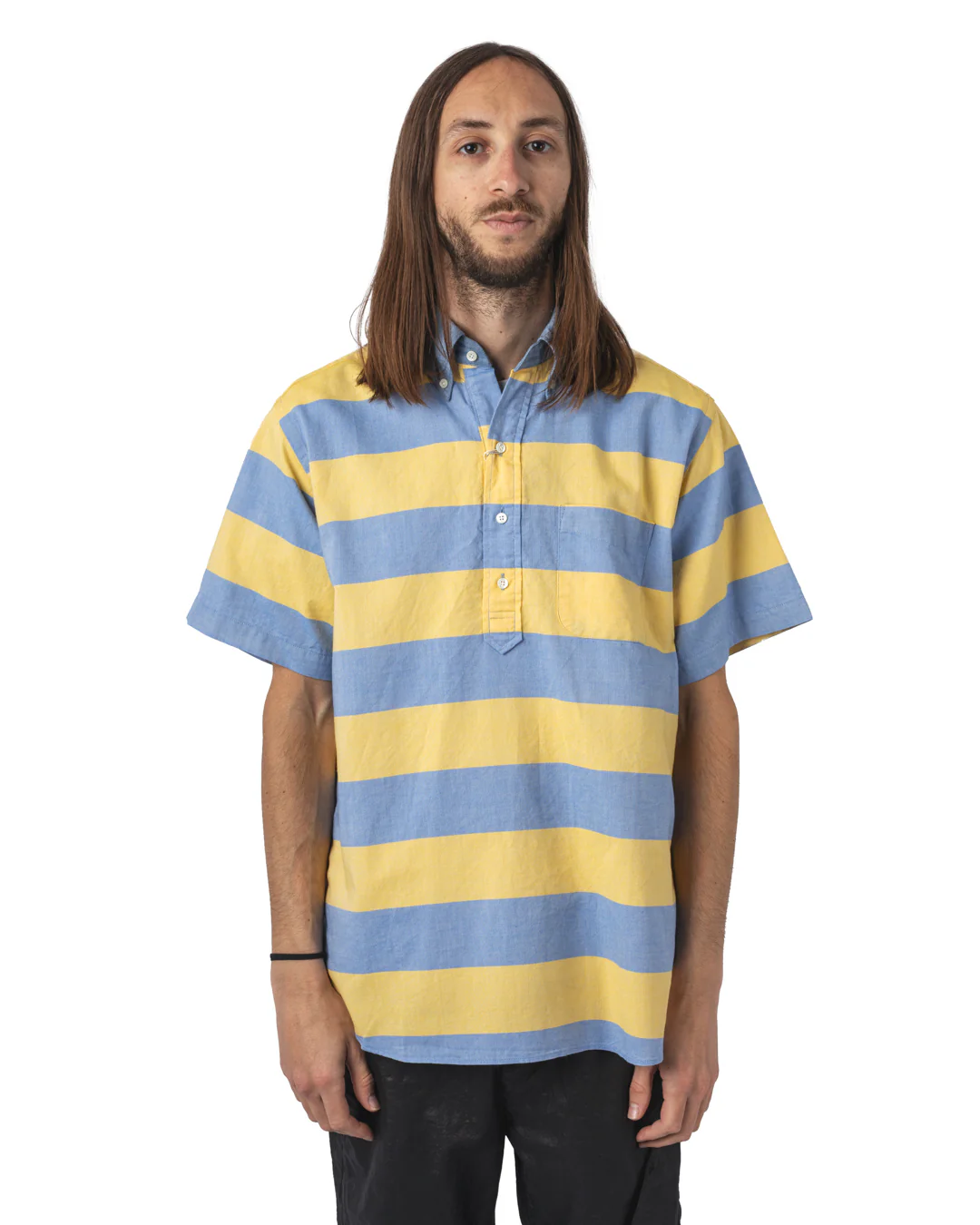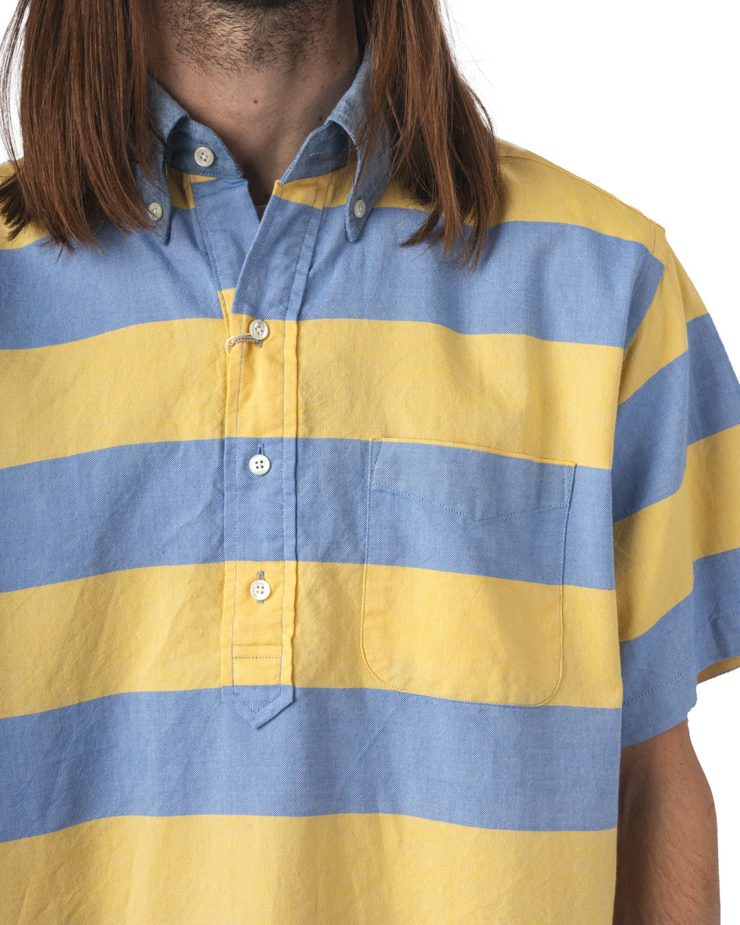 La chemise B.D. Pullover Classic-Fit Oxford Stripe incarne cette philosophie. Confectionnée au Japon à partir de coton 100 %, elle arbore un motif rayé intemporel. Son design à demi-patte de boutonnage et col boutonné évoque les chemises américaines vintage, tandis que sa coupe ample assure un confort décontracté. Les finitions soignées, telles que les coutures étroites de 3 mm et les points de renfort en forme de « + » sur les côtés, témoignent d’un savoir-faire méticuleux.