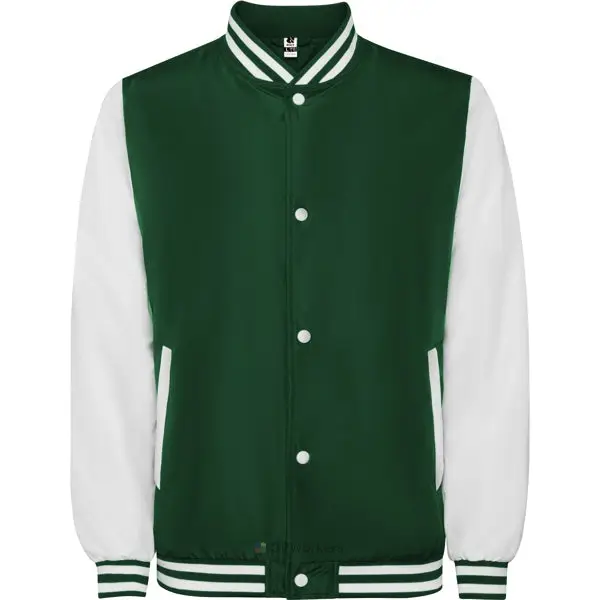 Veste légèrement rembourrée unisexe en deux couleurs. Col, poignets et bas côtelés 1×1, avec deux lignes contrastées. Poches latérales avec fermeture éclair. Intérieur fourré. Boutons-pression avec finition en plastique contrastée. Accès intérieur sur la poitrine gauche et le dos pour le marquage.