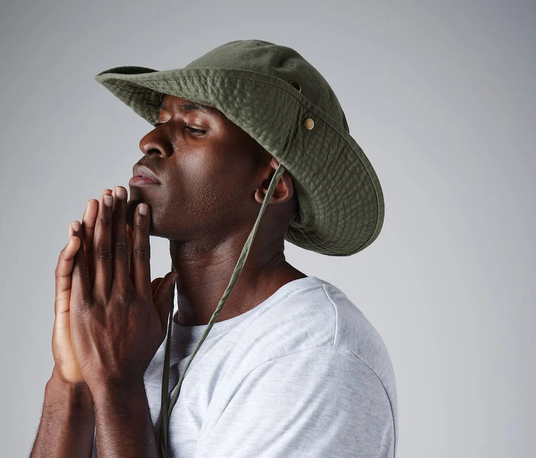 Protection contre le soleil UPF 50+ Taille ajustable par élastique à l’intérieur du chapeau Cordon extérieur réglable avec sa boucle en cuir Toile 100% Coton LOURD Conforme BS 8466 Taille unique mais réglable