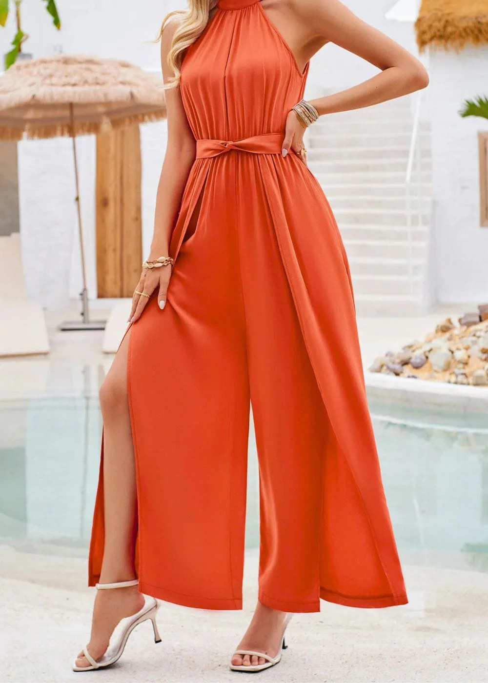 Imagine-toi sous le soleil radieux, dans cette magnifique combinaison demoiselle d’honneur terracotta, prête à briller lors de n’importe quelle occasion spéciale. Cette pièce, à la coupe sans manches et au col haut, sublime ta silhouette en mettant l’accent sur une taille délicatement marquée. Sa couleur terracotta, à la fois audacieuse et délicate, réchauffe le teint et appelle au voyage.