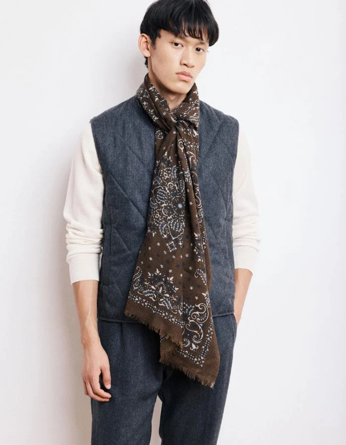 L’écharpe Bandana réinterprète avec modernité un motif emblématique de notre collection. Son imprimé bandana, graphique et intemporel, s’invite sur une étoffe en laine douce et légère, idéale pour les saisons fraîches. Son format allongé de 70 x 180 cm permet de la nouer facilement autour du cou ou de la porter en superposition avec un manteau ou une veste. Fabriquée en Inde, elle associe confort, style et tradition textile.