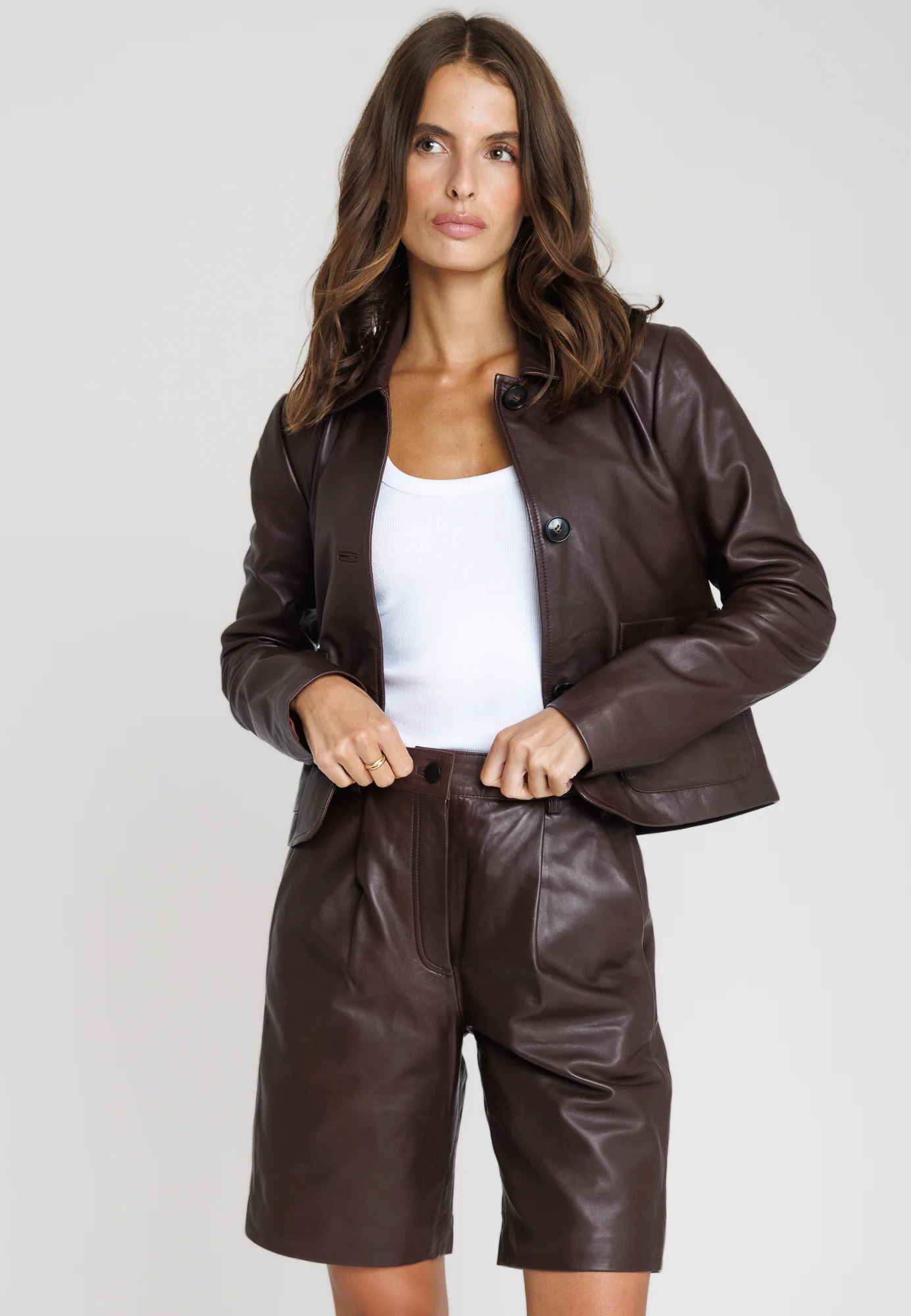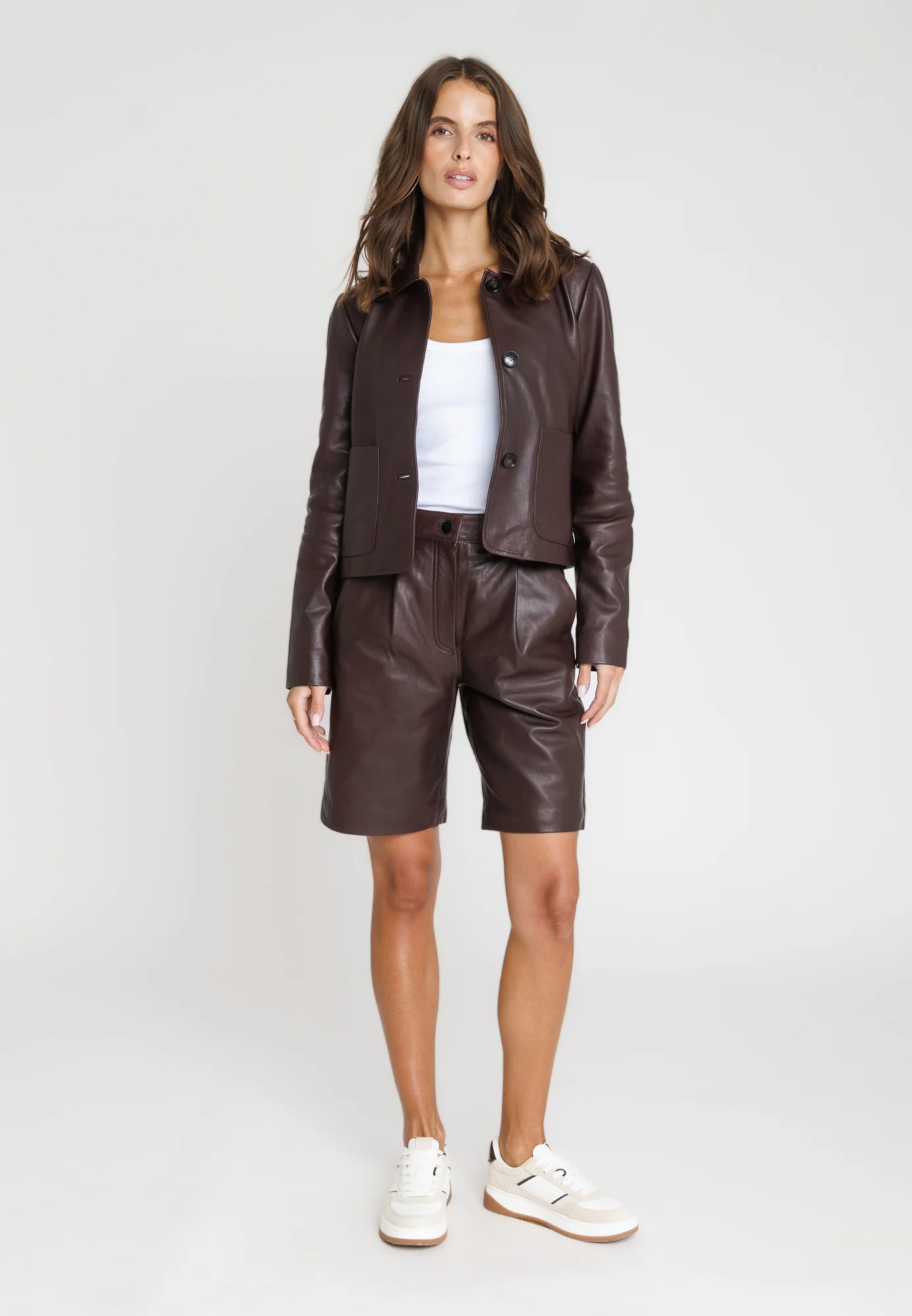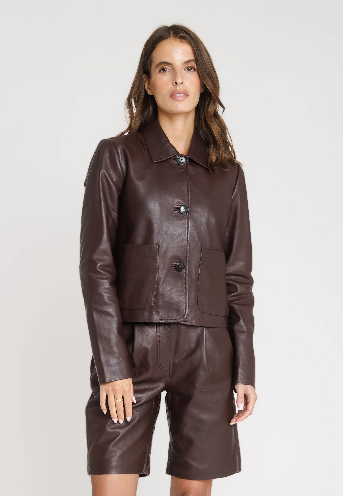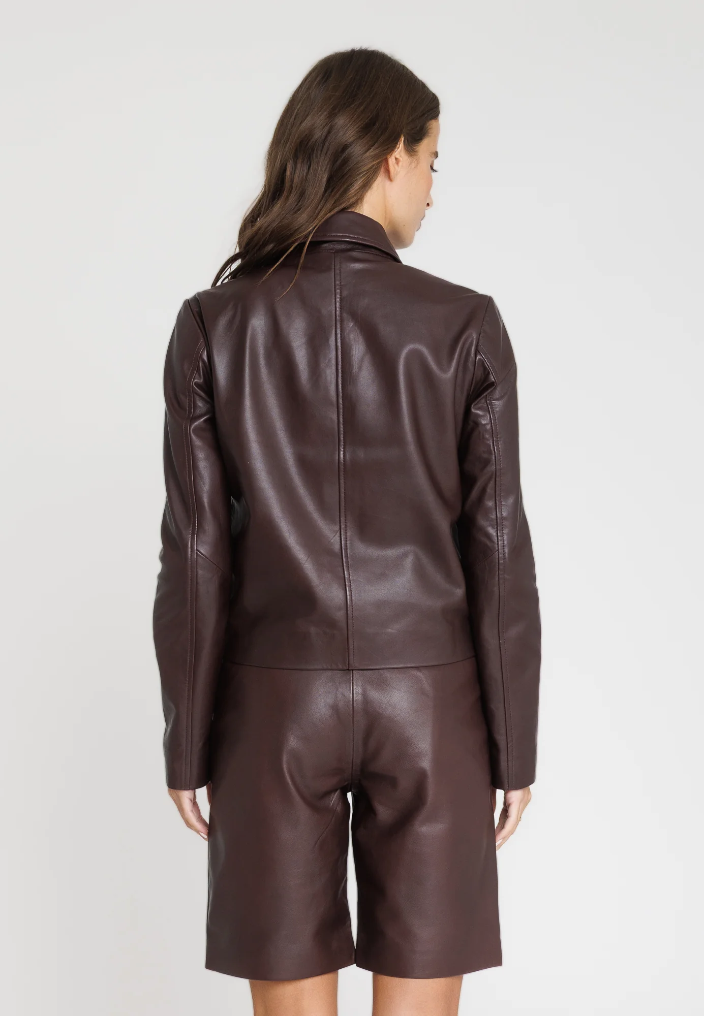 Découvrez ELINA, une veste en cuir au caractère affirmé, réalisée dans une somptueuse qualité d’agneau pleine fleur. Sa teinte dark wine profonde et raffinée apporte une touche de luxe moderne à votre vestiaire.