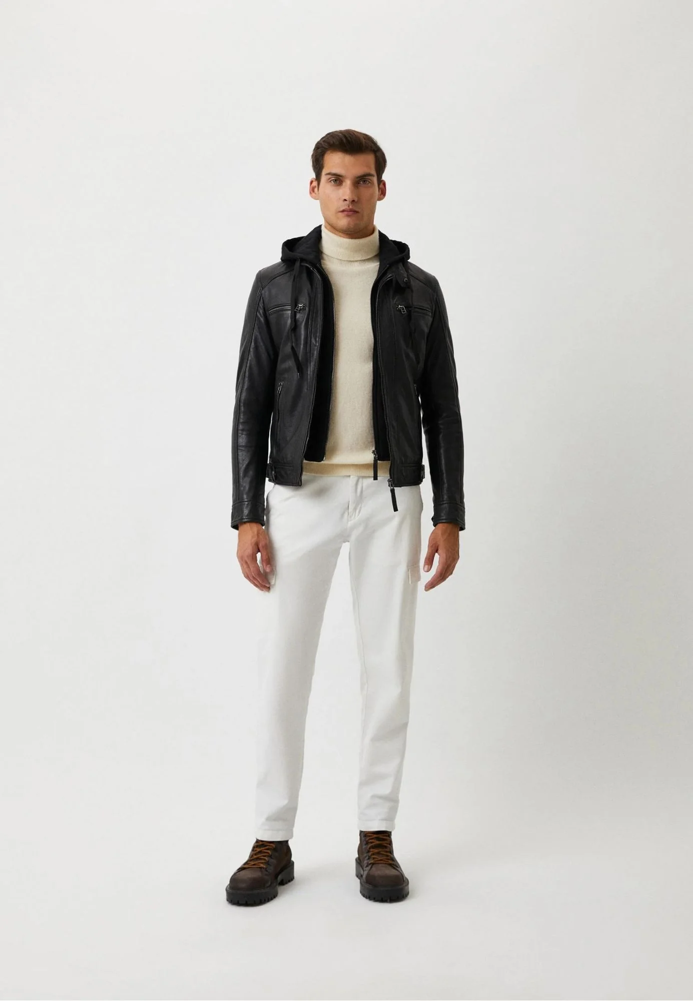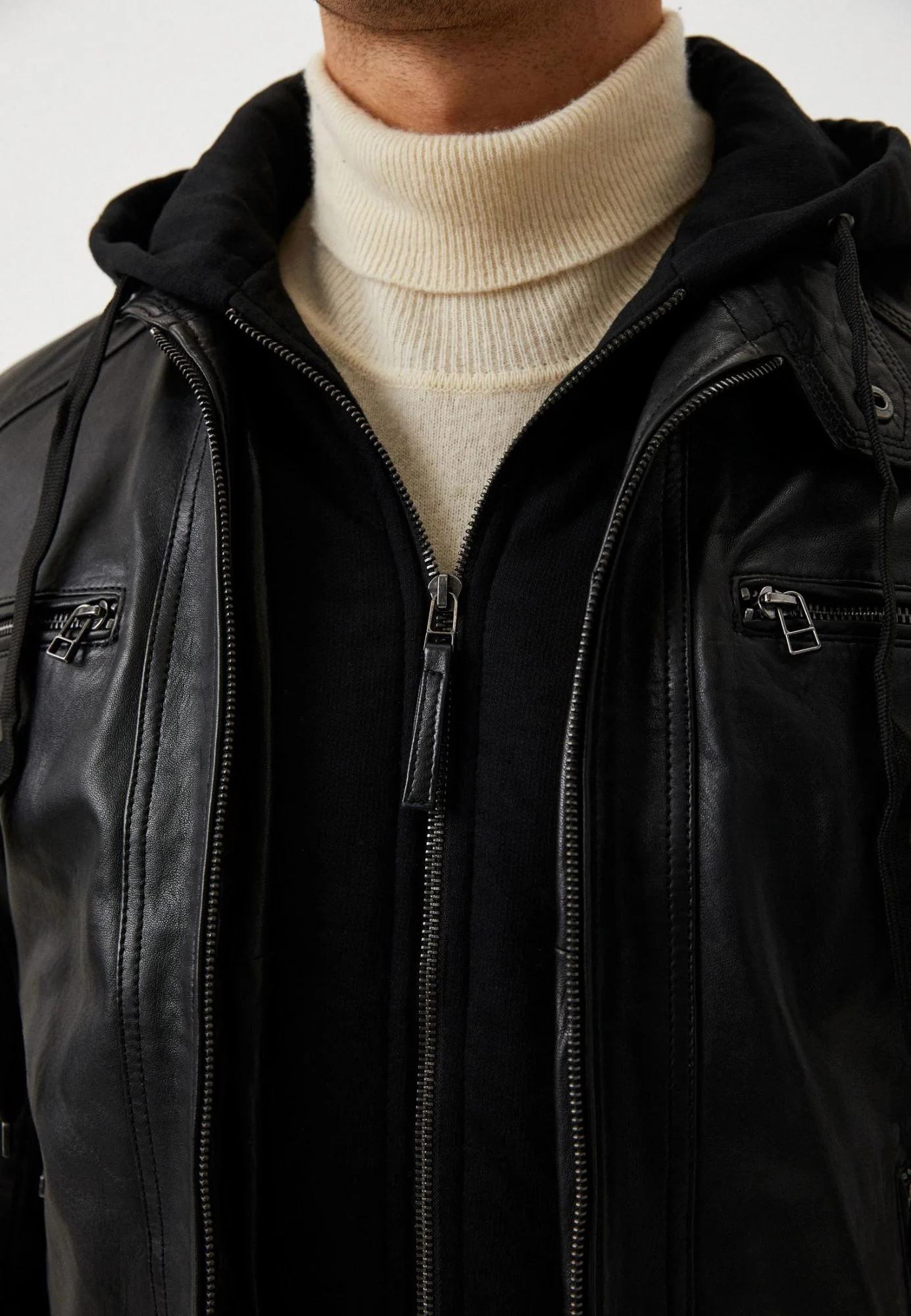 L’ICONIC de nos blousons col motard en cuir de mouton à capuche amovible.