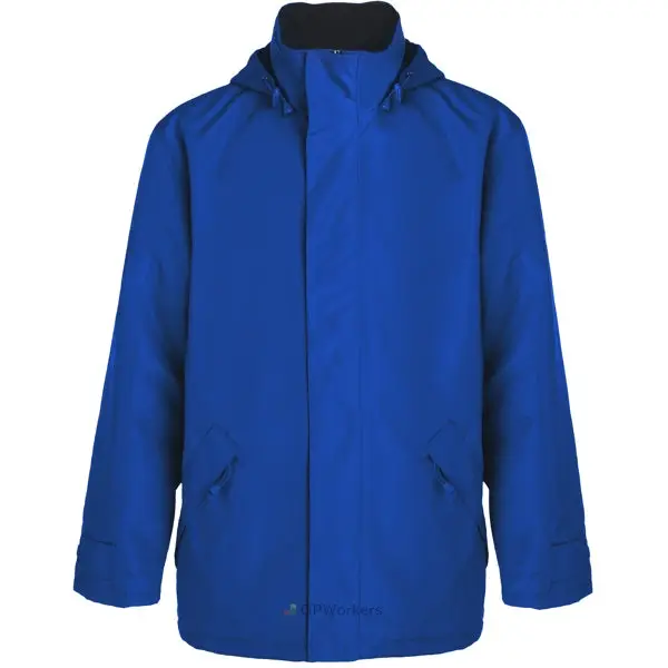 Parka imperméable rembourrée.· Zip central injecté ton sur ton avec rabat.· Col montant avec capuche pliée amovible.· Poches latérales avec fermeture éclair et rabat.· Poignets réglables avec velcro.· Deux poches poitrine intérieures avec fermeture velcro.· Accès intérieur pour sérigraphie ou broderie.