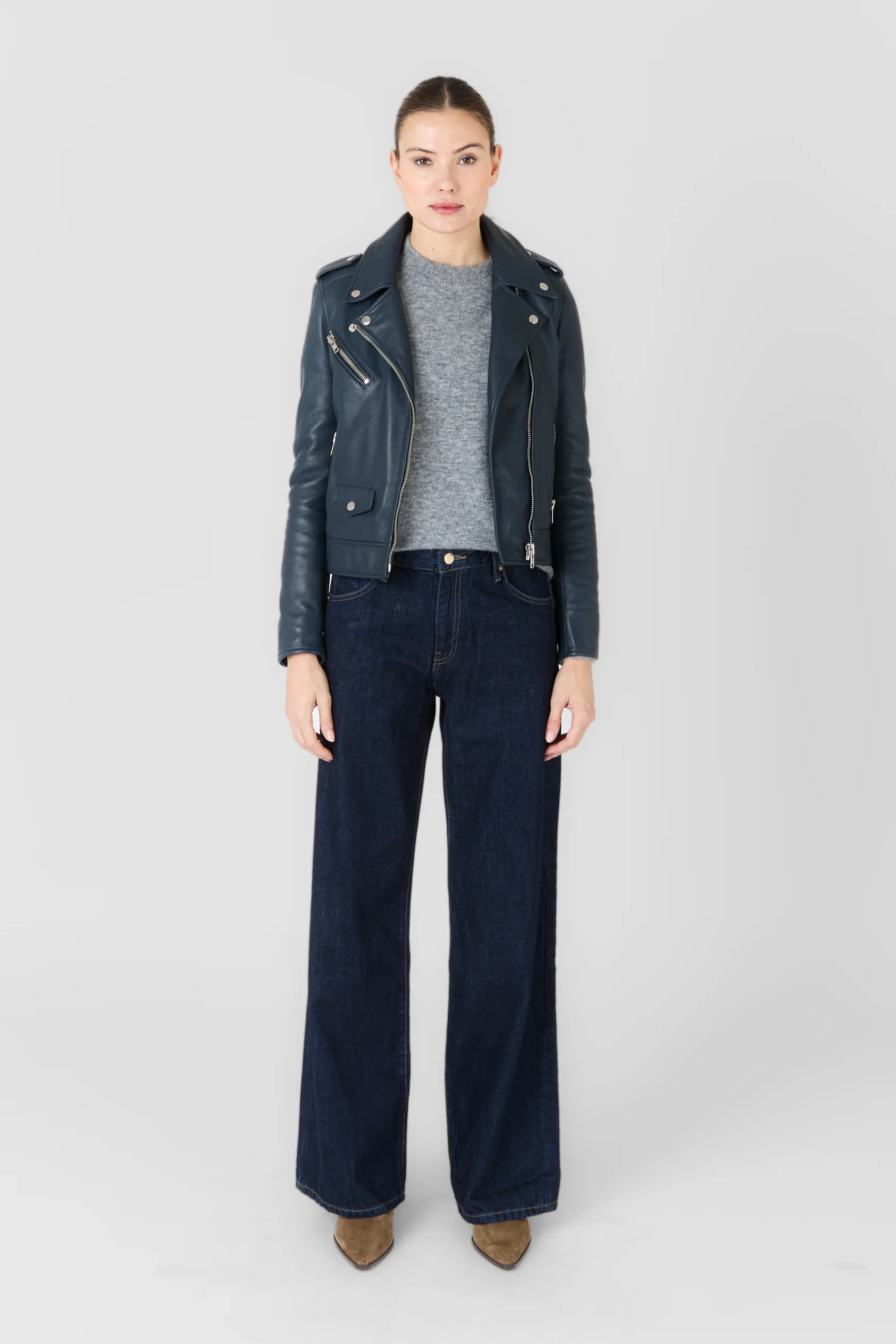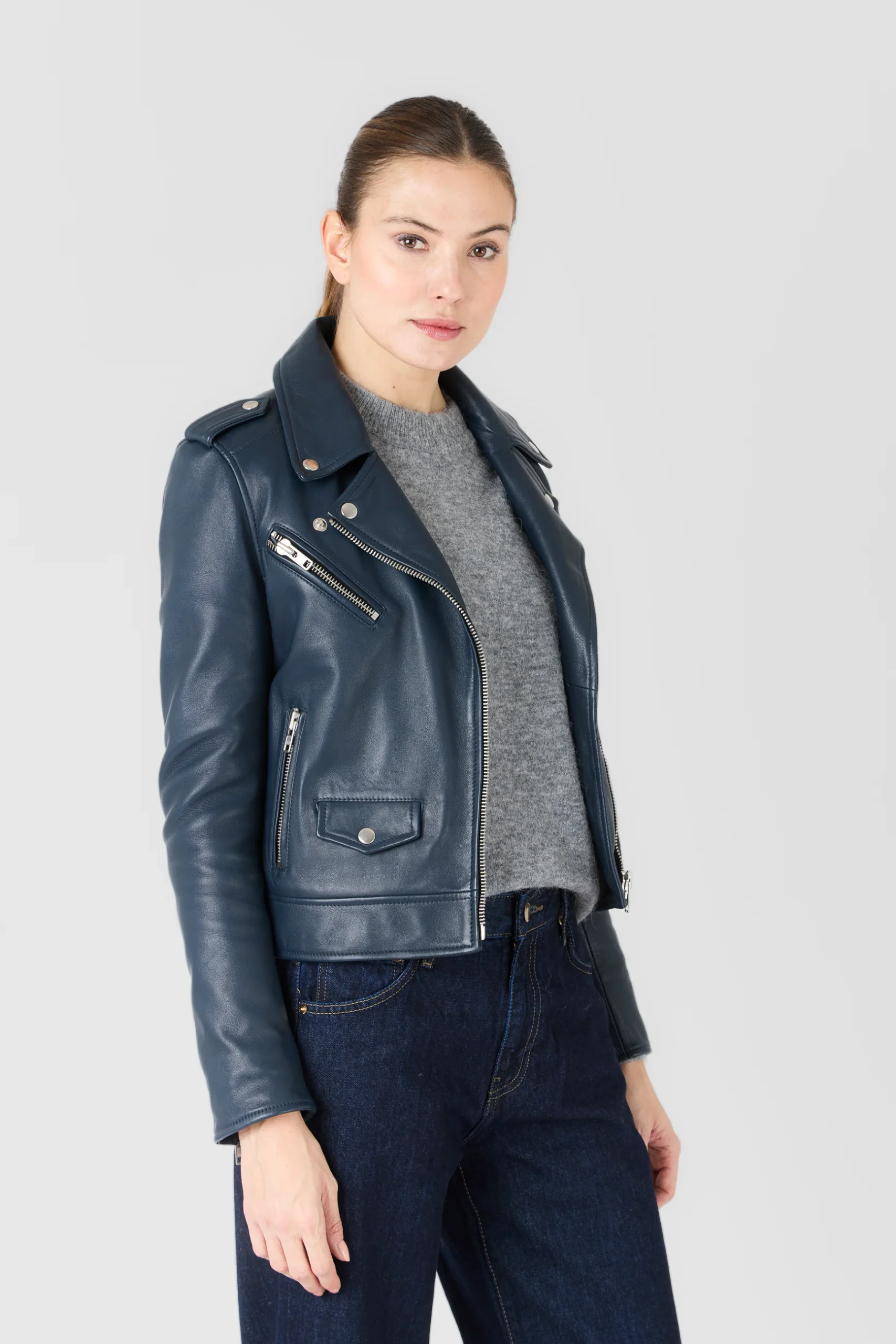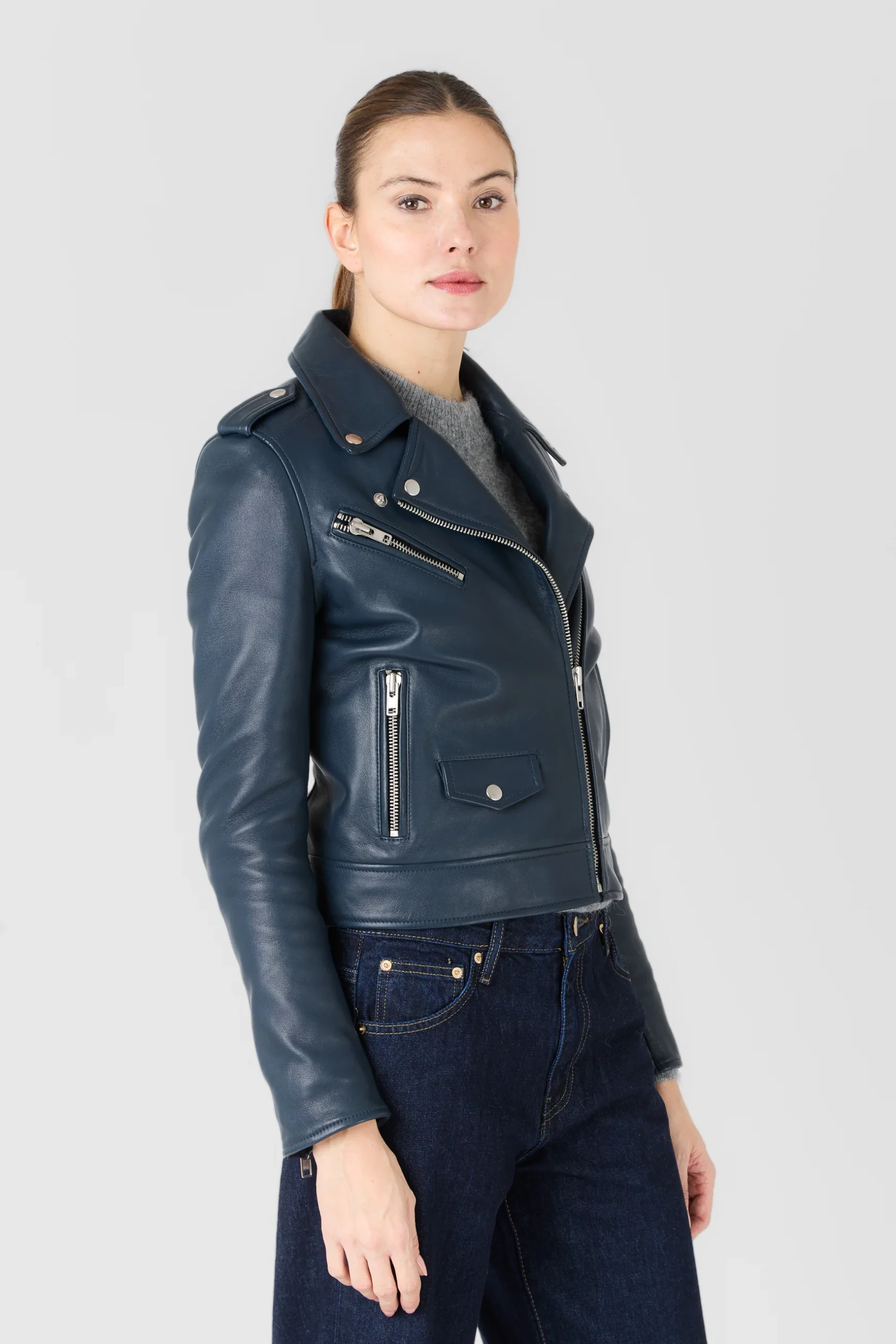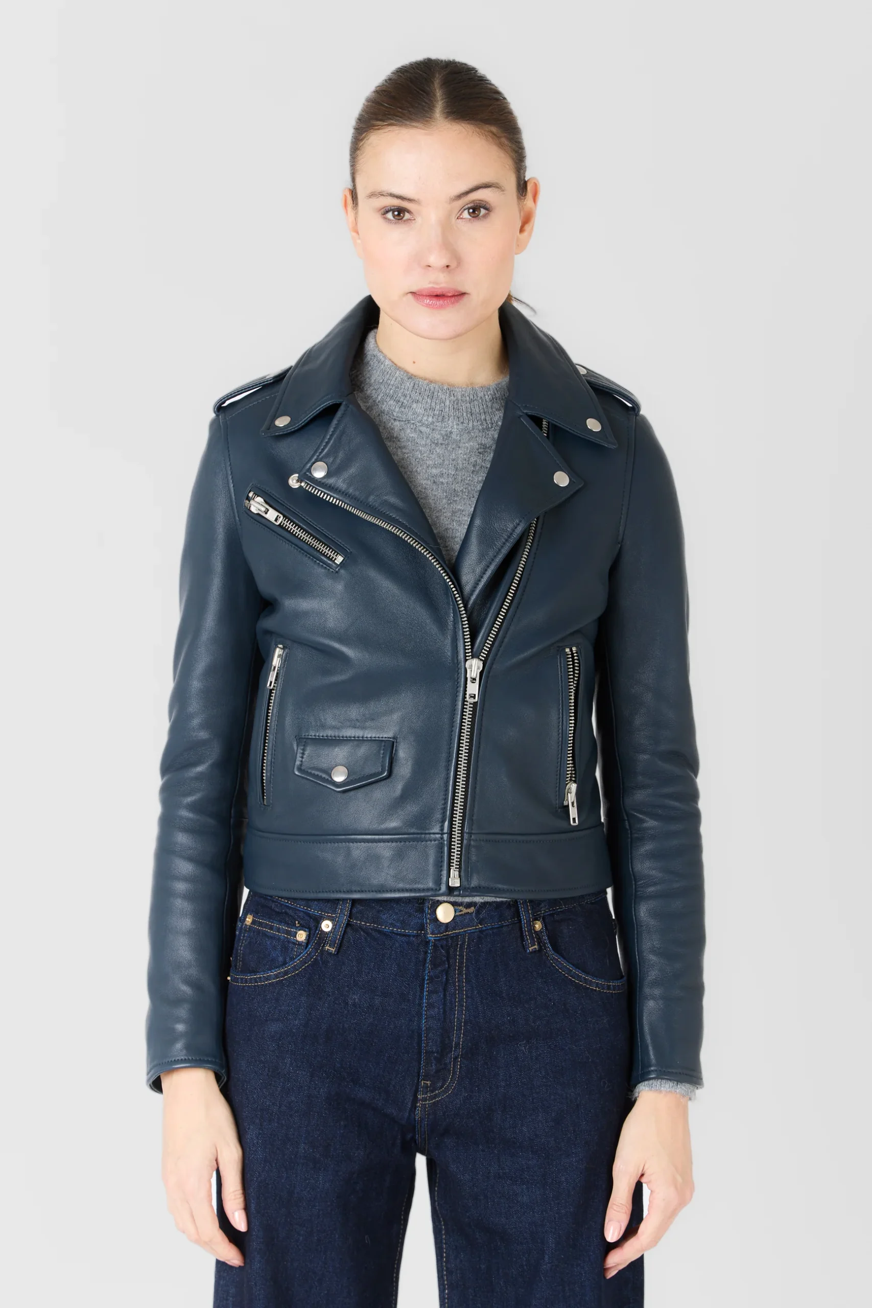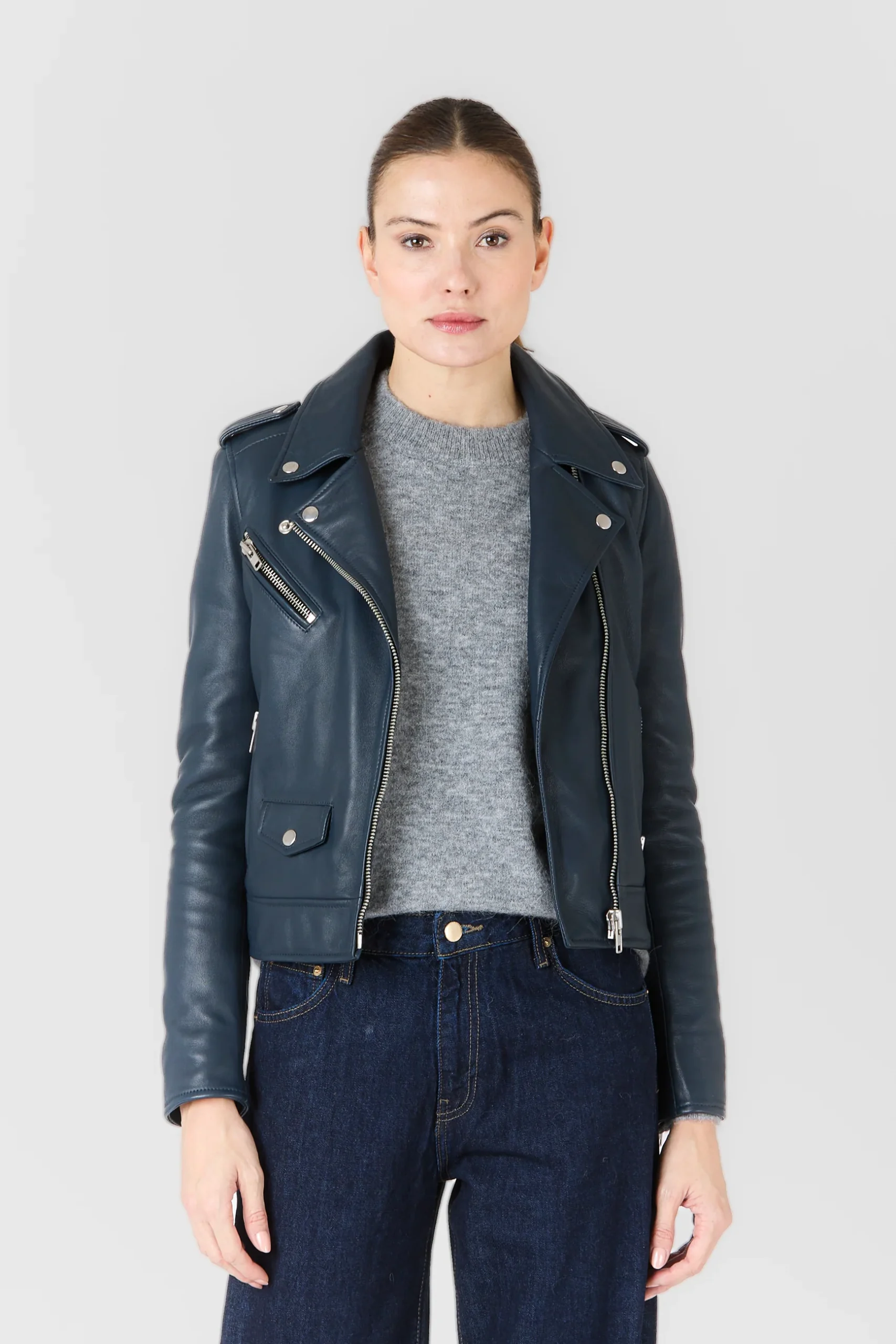 Dessinée dans une coupe ajustée et féminine, EVA joue les équilibres entre force et raffinement. Les finitions métalliques argentées, les zips polis et les surpiqûres nettes soulignent l’attention portée au moindre détail. Portée ouverte pour une allure désinvolte ou fermée pour une silhouette plus affirmée, elle traverse les saisons avec assurance.