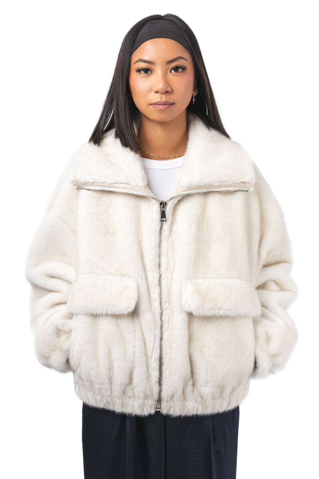 Description : En fausse fourrure épaisse non extensible Se porte oversize Fermeture éclair Emmanchure basse Poches fendues Ourlet élastique Écru Matières : 100% polyester