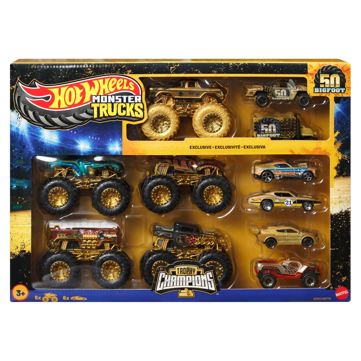 - Le coffret multiple Trophy Champions (Champions de trophées) Monster Trucks Hot Wheels rend hommage au 50e anniversaire de Bigfoot, le premier Monster Trucks, avec 5 camions miniatures et 6 voitures miniatures.