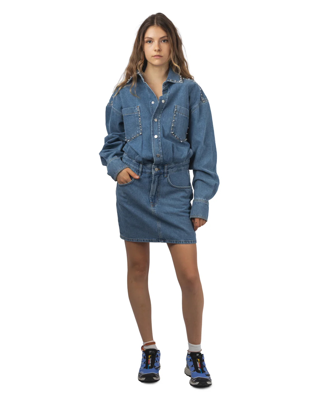 La Ilene Embo Denim Dress est une robe chemise confectionnée en denim de coton, pensée pour un style à la fois décontracté et affirmé. Elle adopte une coupe droite légèrement ample, un col classique et une fermeture boutonnée sur toute la longueur. Ses broderies décoratives, signature fantaisie de la maison, ajoutent une touche artistique et ludique à une base utilitaire.