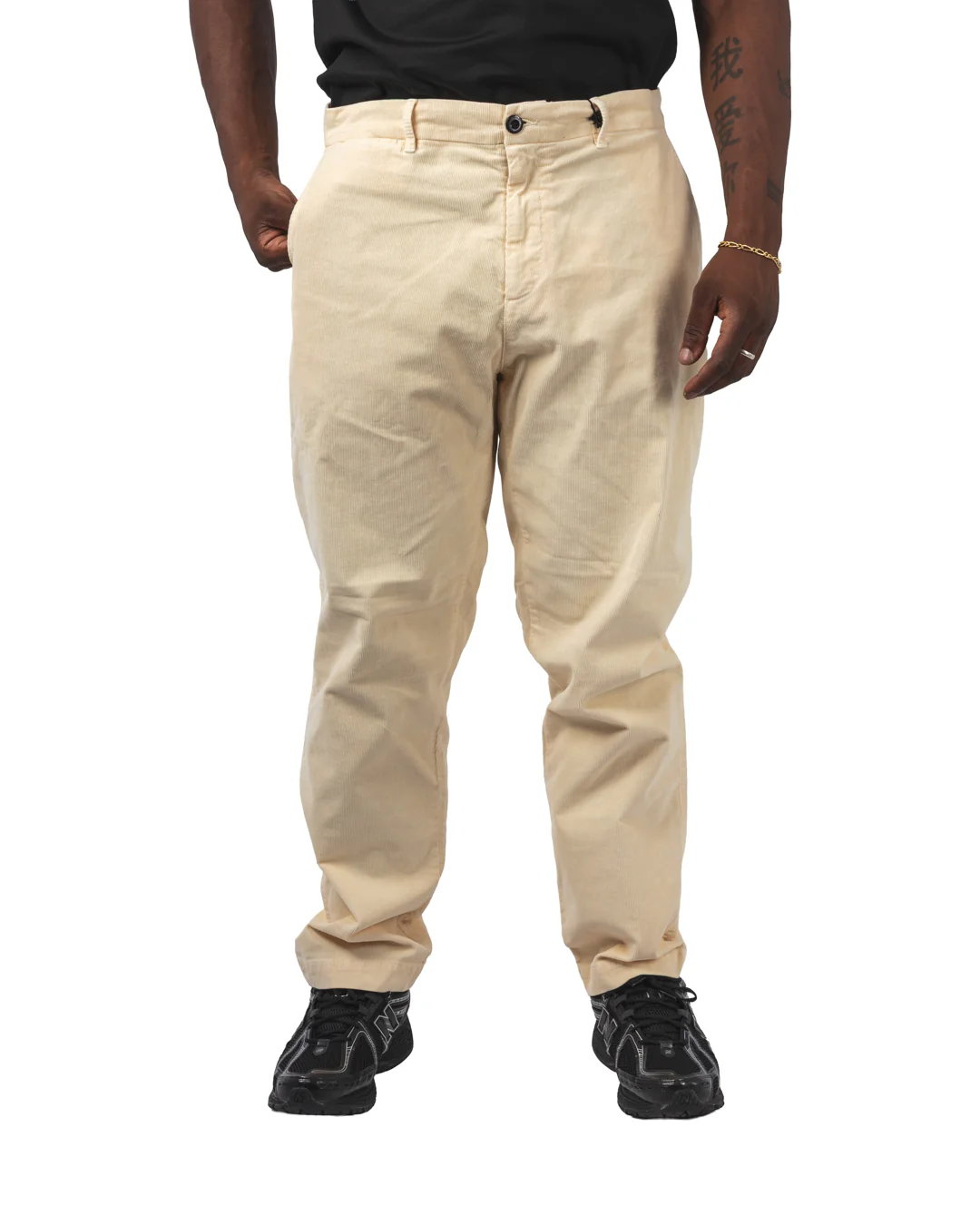 Confectionné en corduroy de coton doux et résistant, il présente une coupe droite ou légèrement fuselée selon les déclinaisons, avec des poches latérales classiques ou cargo, une taille ajustable et des détails soignés. Certains modèles sont rehaussés de l’œillet en verre signature sur la poche, ajoutant une touche technique au charme rétro du velours.