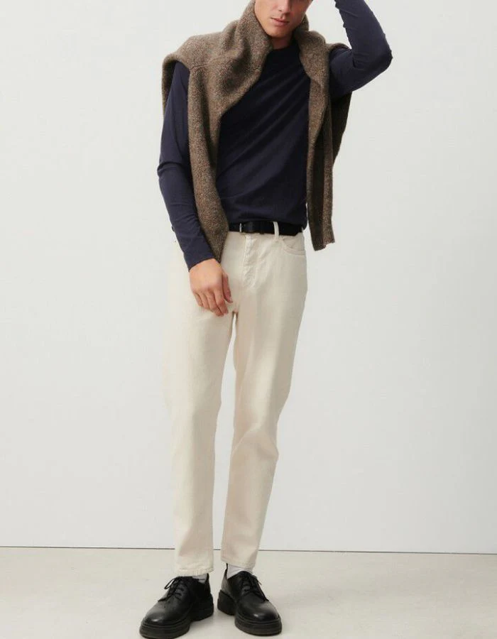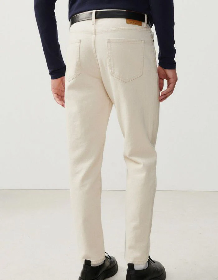 Doté d’une braguette à zip et bouton, de passants de ceinture et de cinq poches classiques, il est également pourvu d’une doublure en coton. Son délavage écru lui confère un style élégant et polyvalent.
