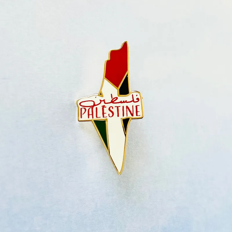 Exprimez votre soutien indéfectible à la Palestine avec ce pin remarquable représentant la carte du pays aux couleurs du drapeau palestinien 🇵🇸, accompagné du mot « Palestine » en français et en arabe.