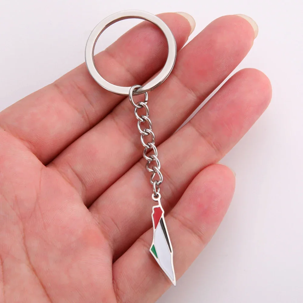 Ce porte-clés carte de la Palestine est bien plus qu’un simple accessoire : c’est un symbole de solidarité avec le peuple palestinien. Certains Palestiniens ayant été chassé de leur terre en 1948 conservèrent dans leur fuite la clé de leur maison. Le porte clé est donc le symbole du droit au retour des Palestiniens.