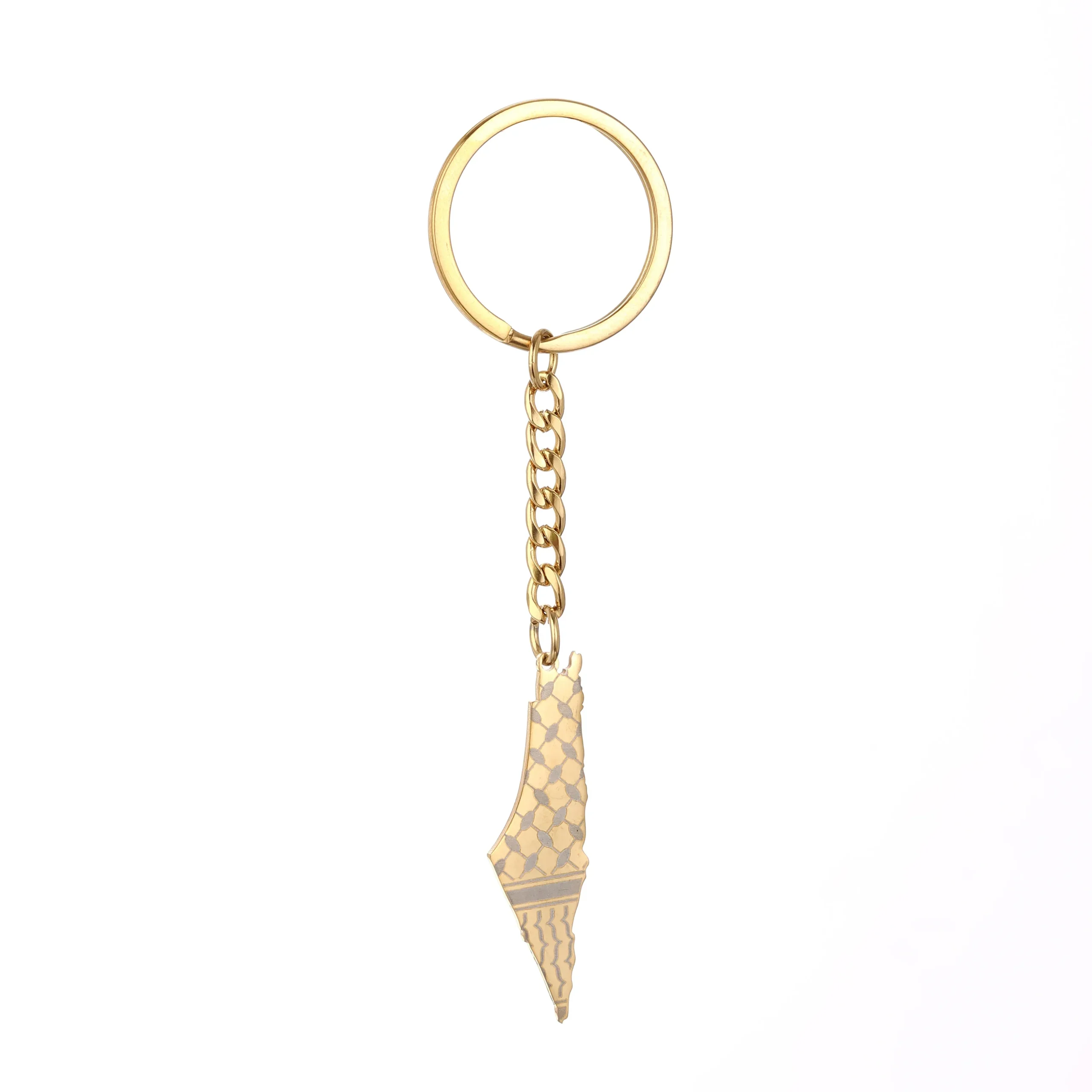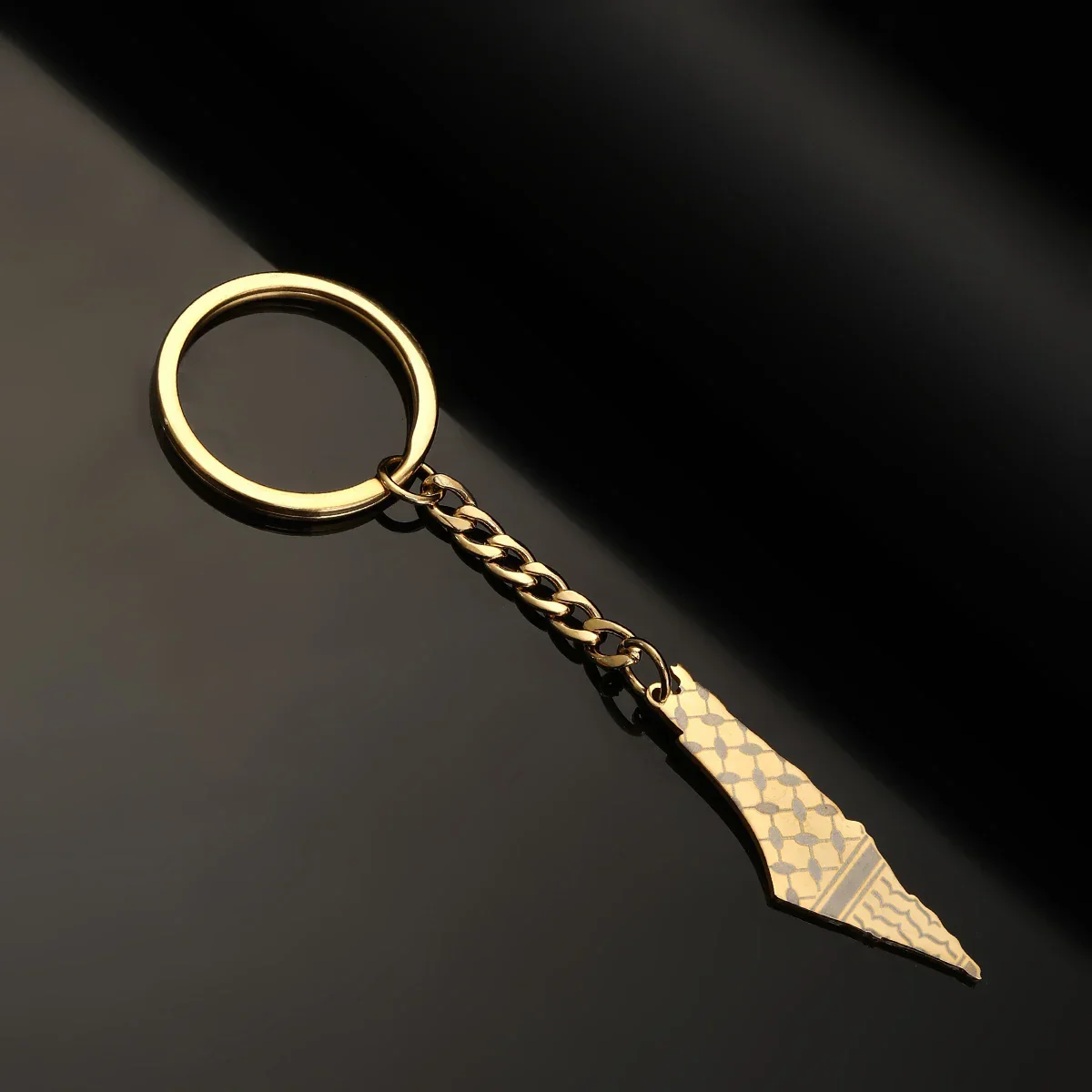 Disponible en couleur or ou argent, ce porte-clés représente la carte de la Palestine, ornée du motif Keffieh Palestinien.