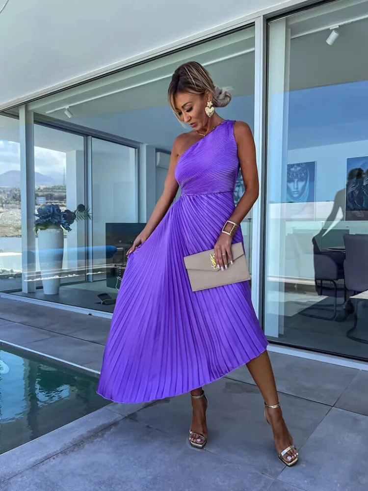 Séduisez l’été en robe asymétrique violette plissée