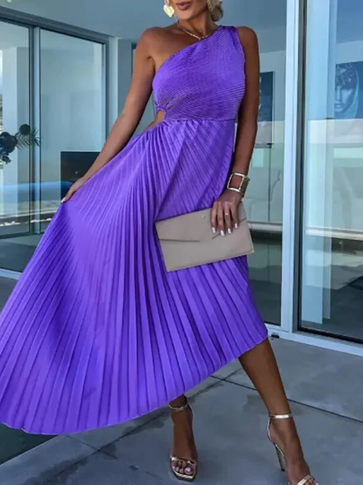 Conçue pour celles qui aiment se distinguer avec subtilité, cette robe violette au col diagonal mêle audace et féminité. Sa coupe asymétrique et plissée épouse délicatement la silhouette tout en offrant un tombé fluide jusqu’à mi-mollet. Le tissu brocart légèrement extensible assure une tenue parfaite et un confort optimal durant les journées estivales. Avec son détail ajouré sur le côté et son allure sans manches, elle incarne la tendance « sexy chic » sans compromis sur l’élégance. Facile à enfiler grâce à sa fermeture pull-over, elle est idéale pour vos événements en plein air, soirées ou cocktails d’été.