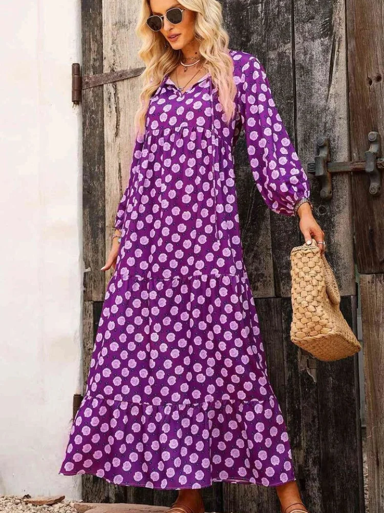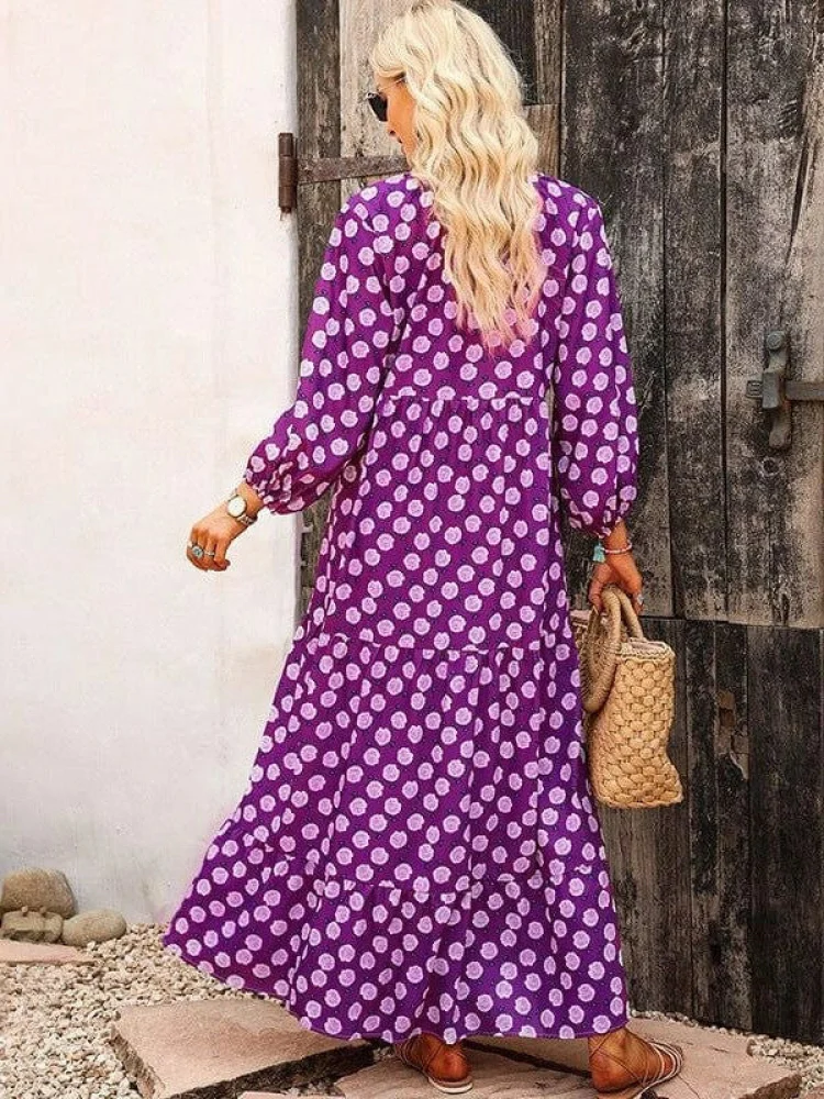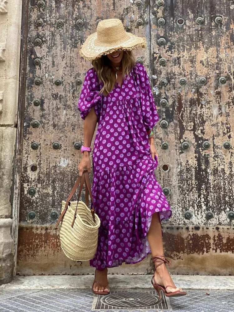 Apportez une touche de liberté et de féminité à votre garde-robe avec cette robe bohème violette à motifs floraux blancs, idéale pour vos journées ensoleillées ou vos escapades estivales.