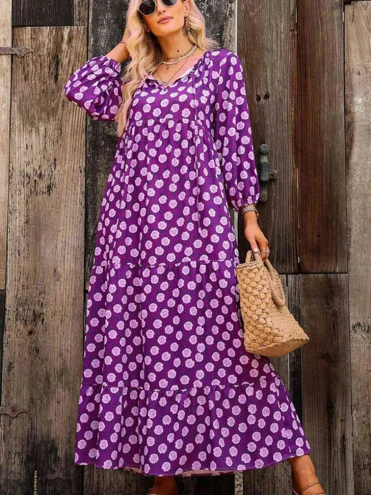 Conçue pour sublimer avec légèreté, cette robe longue présente une silhouette ample et fluide qui accompagne chacun de vos mouvements. Son tissu violet éclatant est parsemé de motifs floraux imprimés qui ajoutent une note romantique à l’ensemble. Le col en V met en valeur le port de tête tandis que les manches bouffantes trois-quarts apportent une touche de douceur. Grâce à sa matière en polyester à élasticité moyenne, elle offre un confort optimal sans sacrifier le style. Avec sa coupe longue jusqu’aux chevilles et sa taille naturellement ajustée, cette robe est parfaite pour un look à la fois casual et raffiné. Associez-la à des sandales ou un sac tressé pour un effet bohème irrésistible.