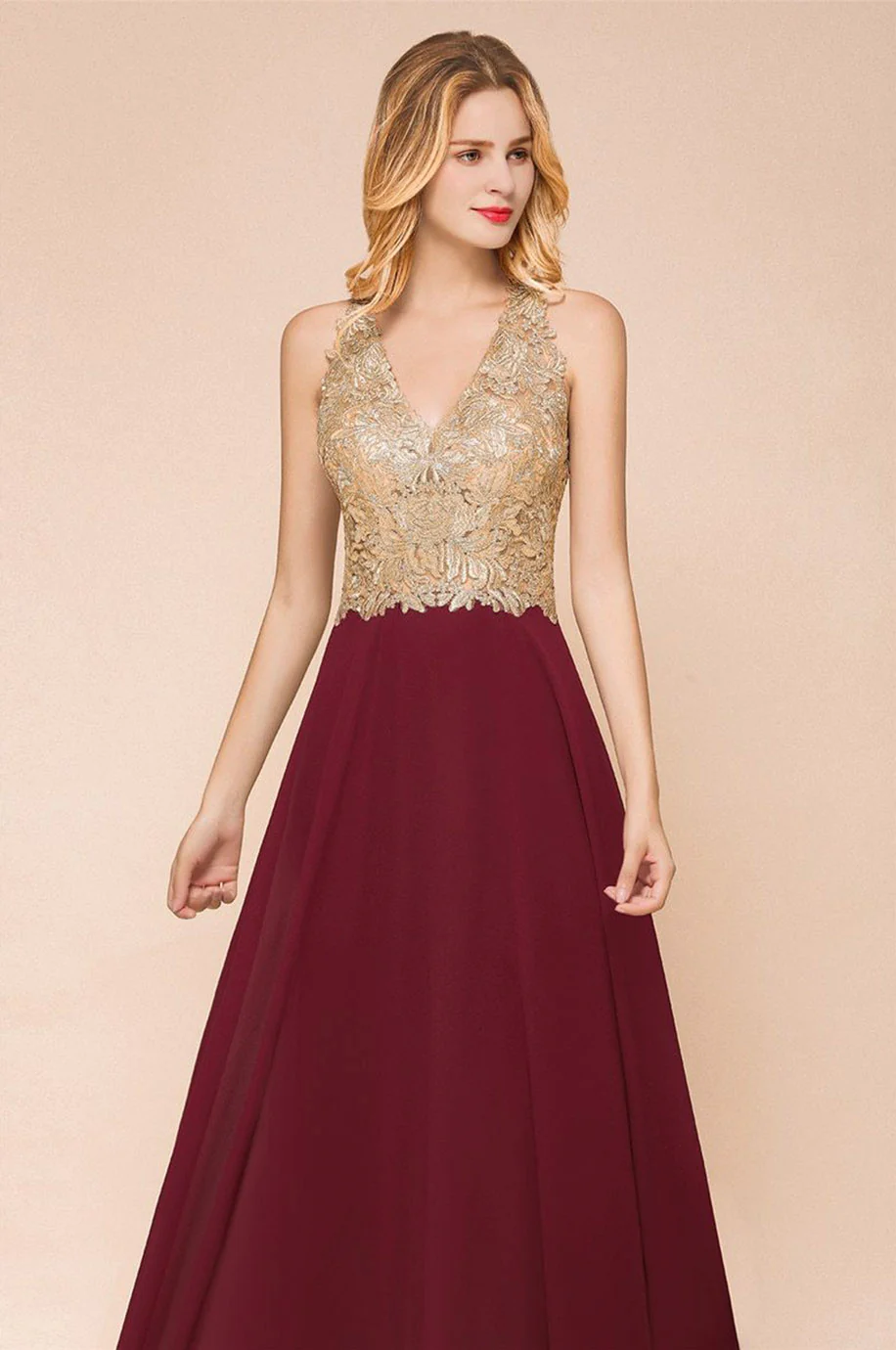 Son look double couleur blanc et bordeaux lui donne un style sobre et raffiné. Son bustier en dentelle blanche dorée associé à la couleur pourpre font de cette robe demoiselle d’honneur couleur bordeaux un véritable bijou.