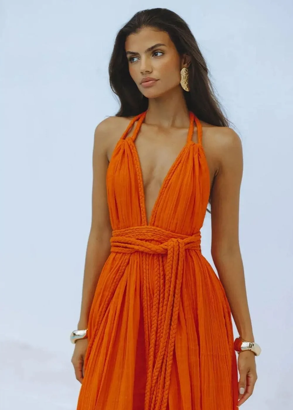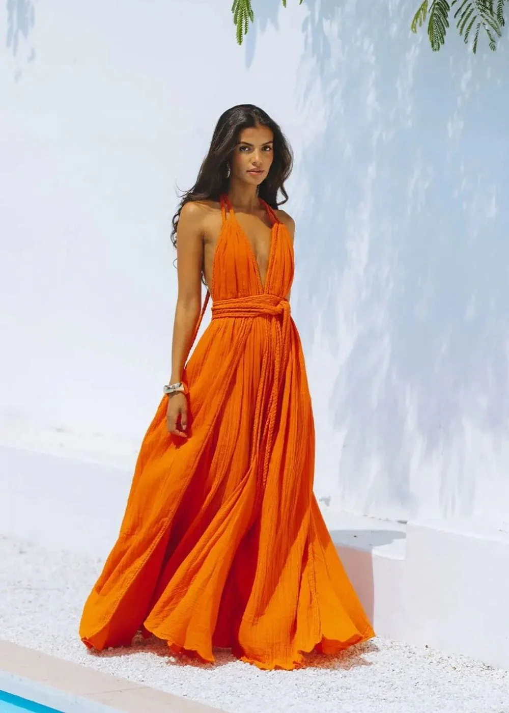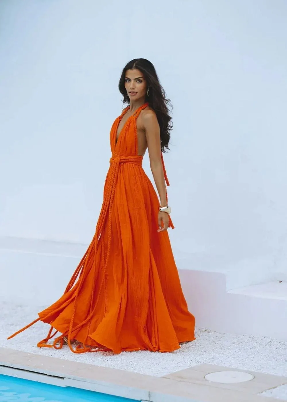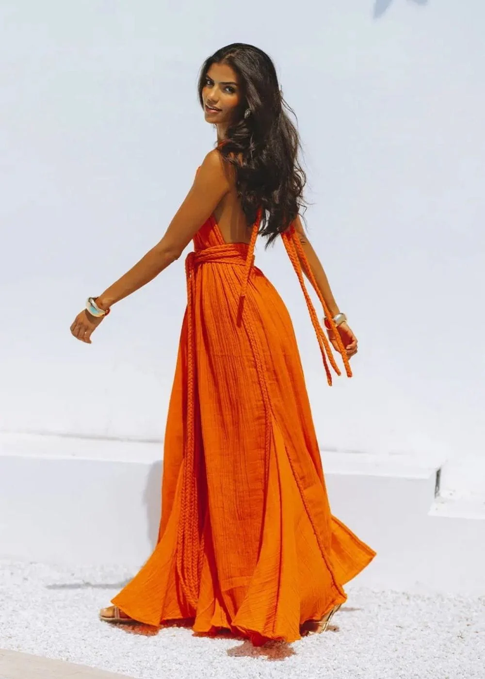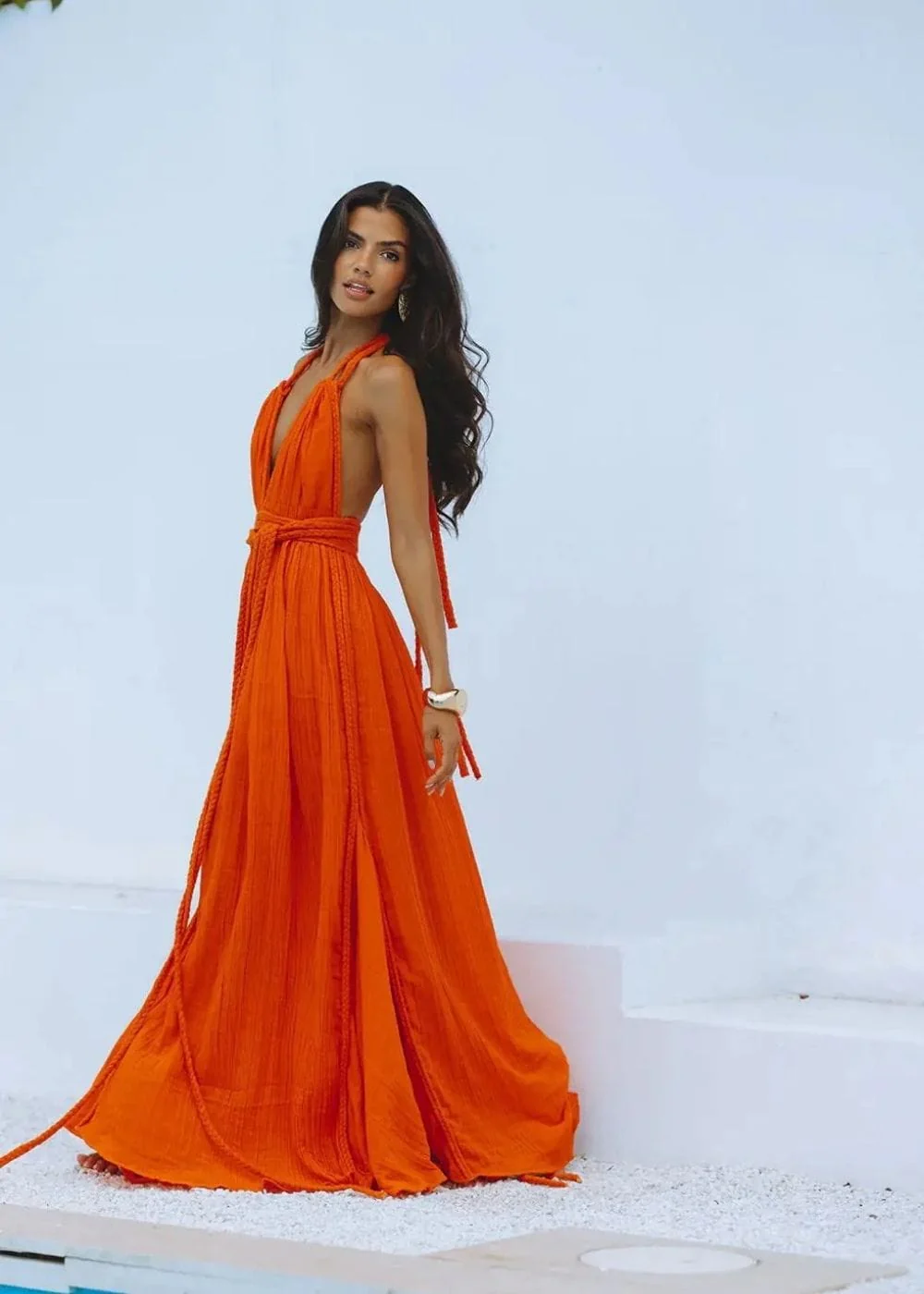 Imagine-toi enveloppée dans la couleur vive et chaleureuse de cette robe été terracotta. Avec sa coupe longue et fluide, elle est idéale pour une promenade en bord de mer ou une soirée estivale. Le dos nu ajoute une touche de sensualité audacieuse, parfait pour te sentir libre et féminine.