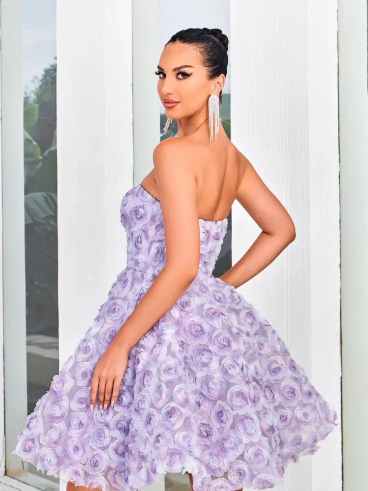 Conçue pour sublimer chaque silhouette, cette robe bustier violette offre une allure à la fois romantique et contemporaine. Son tissu orné de fleurs en relief crée un effet 3D captivant, tandis que sa coupe évasée au-dessus du genou assure une parfaite liberté de mouvement. Grâce à sa confection en mélange de polyester et spandex, la robe épouse délicatement les formes tout en apportant un confort optimal. Le décolleté en cœur sans bretelles met en valeur les épaules avec élégance, pour un look à la fois glamour et sophistiqué. Une fermeture zippée discrète au dos assure un maintien fiable tout au long de la journée ou de la soirée.