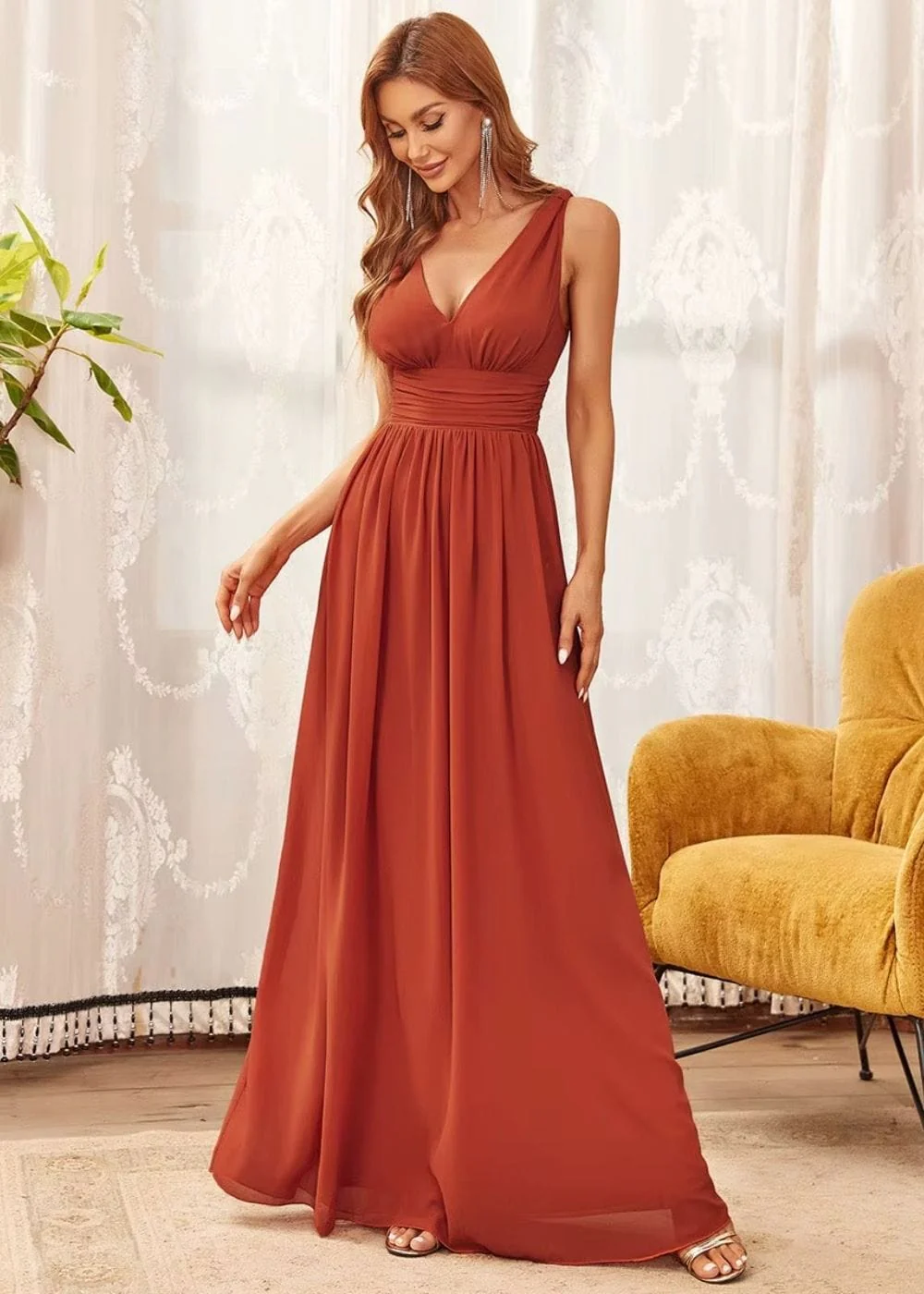 Laisse-toi séduire par cette magnifique robe longue couleur terracotta, idéale pour un mariage en extérieur ou une soirée estivale. Sa coupe fluide et évasée épouse tes mouvements avec légèreté, te procurant une aisance incomparable. Le décolleté en V met subtilement en valeur ta silhouette, tandis que la taille est parfaitement marquée par une ceinture drapée qui souligne tes courbes. La couleur terracotta apporte une touche chaleureuse et naturelle, parfaite pour les journées ensoleillées ou les soirées sous le ciel étoilé.