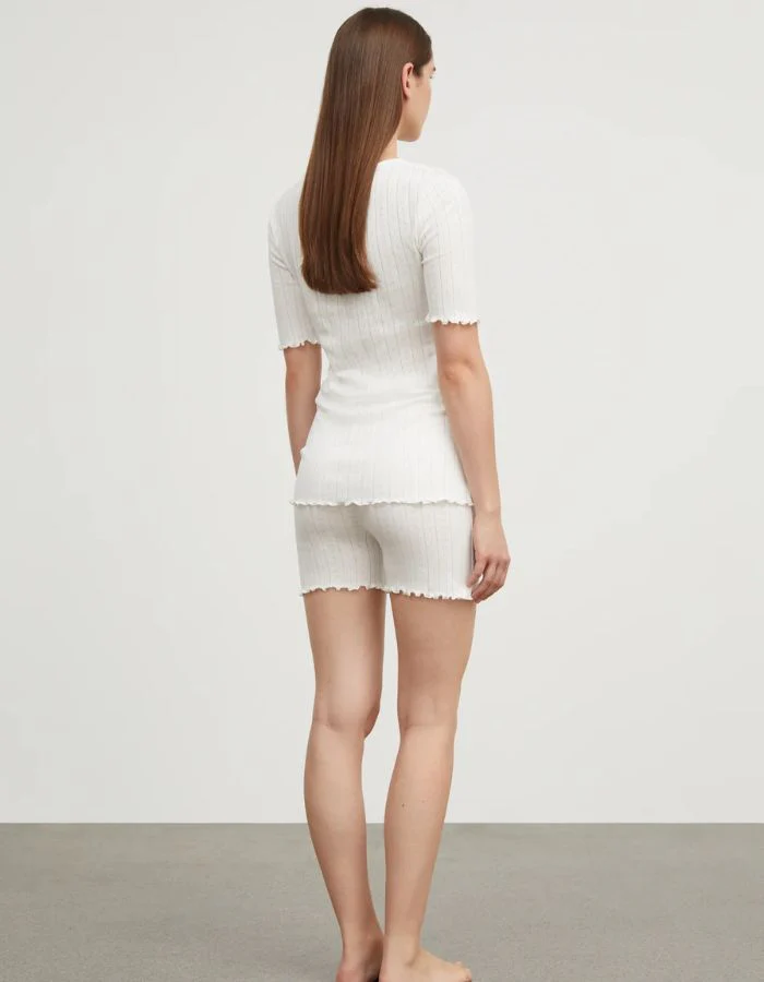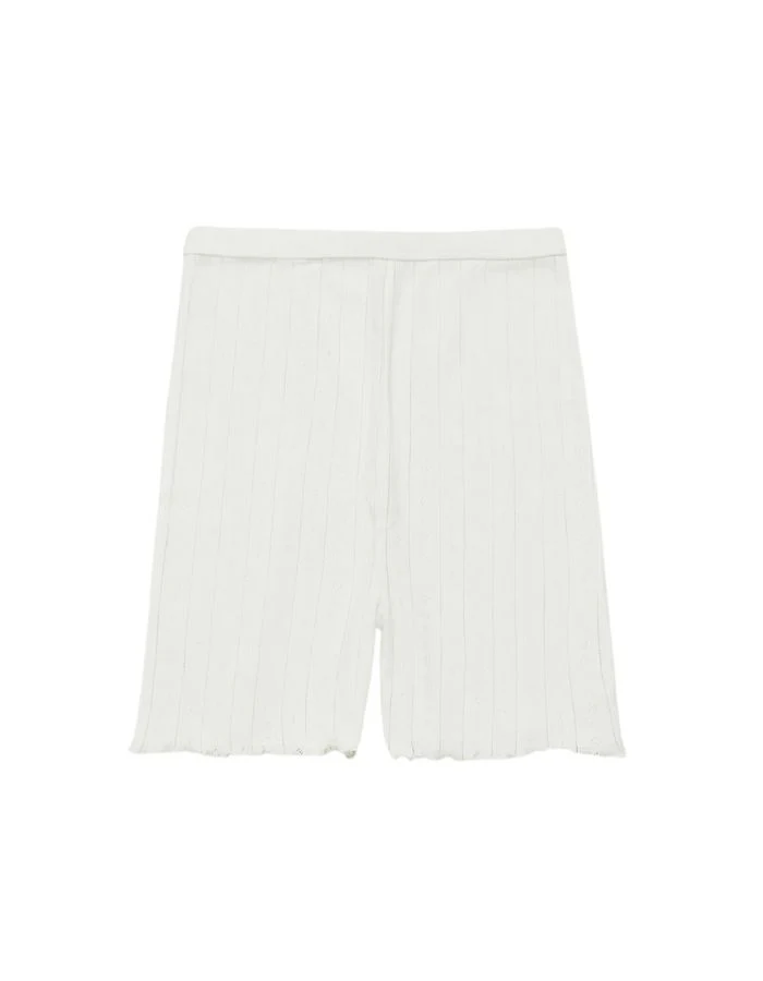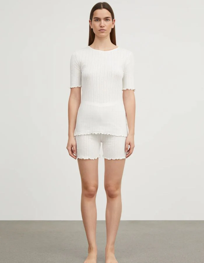 Le short Edie Blanc de Skall Studio, confectionné en jersey de coton pointelle, allie confort et élégance décontractée, parfait pour un look estival sophistiqué.