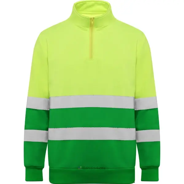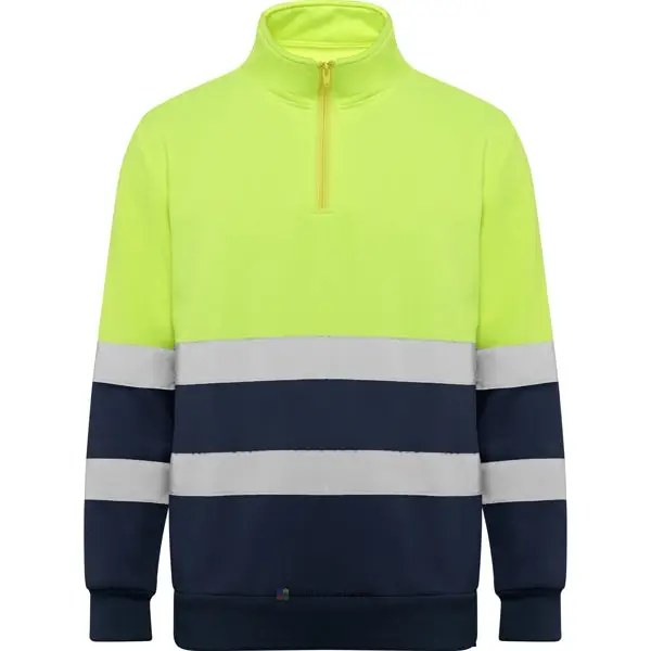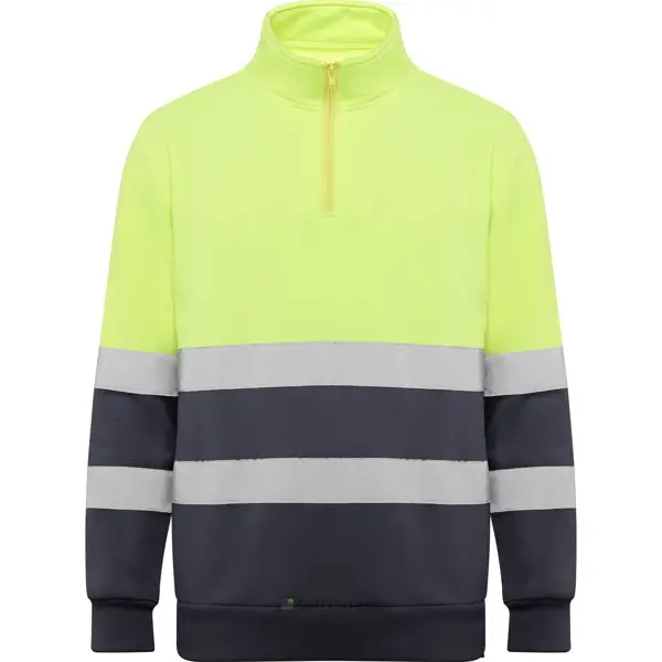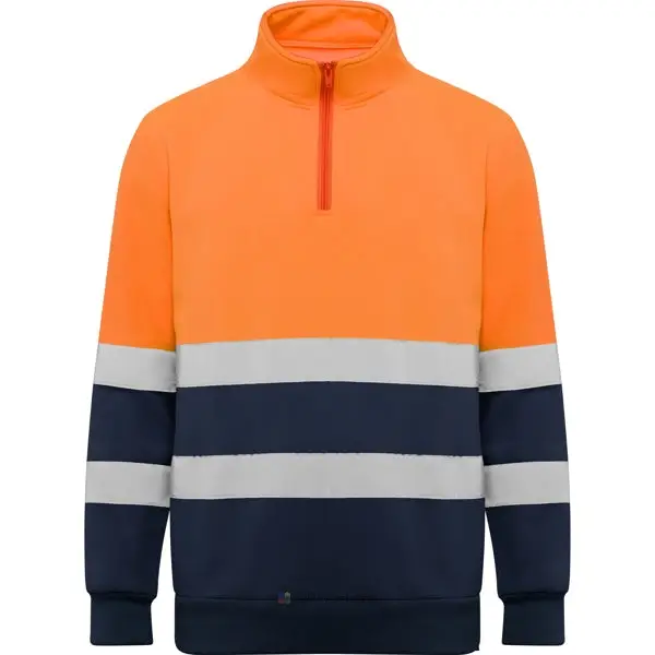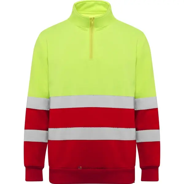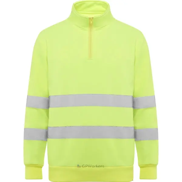 Sweat haute visibilité avec zip.· Col haut avec protège-menton et tirette.· Deux bandes réfléchissantes horizontales sur le torse et les manches.· Bande de propreté renforcées à l’intérieur du cou.· Maille en côte 1×1 aux poignets et bas.