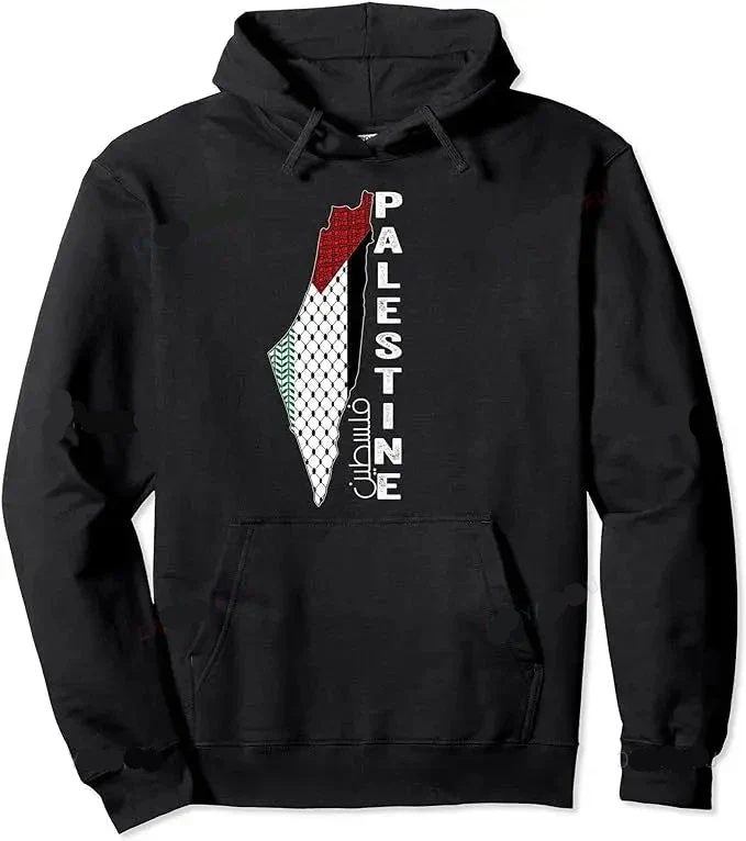 Notre Sweat à capuche homme Palestine présente la carte du pays aux couleurs du drapeau palestinien 🇵🇸, accompagnée de motifs keffiehs traditionnels.