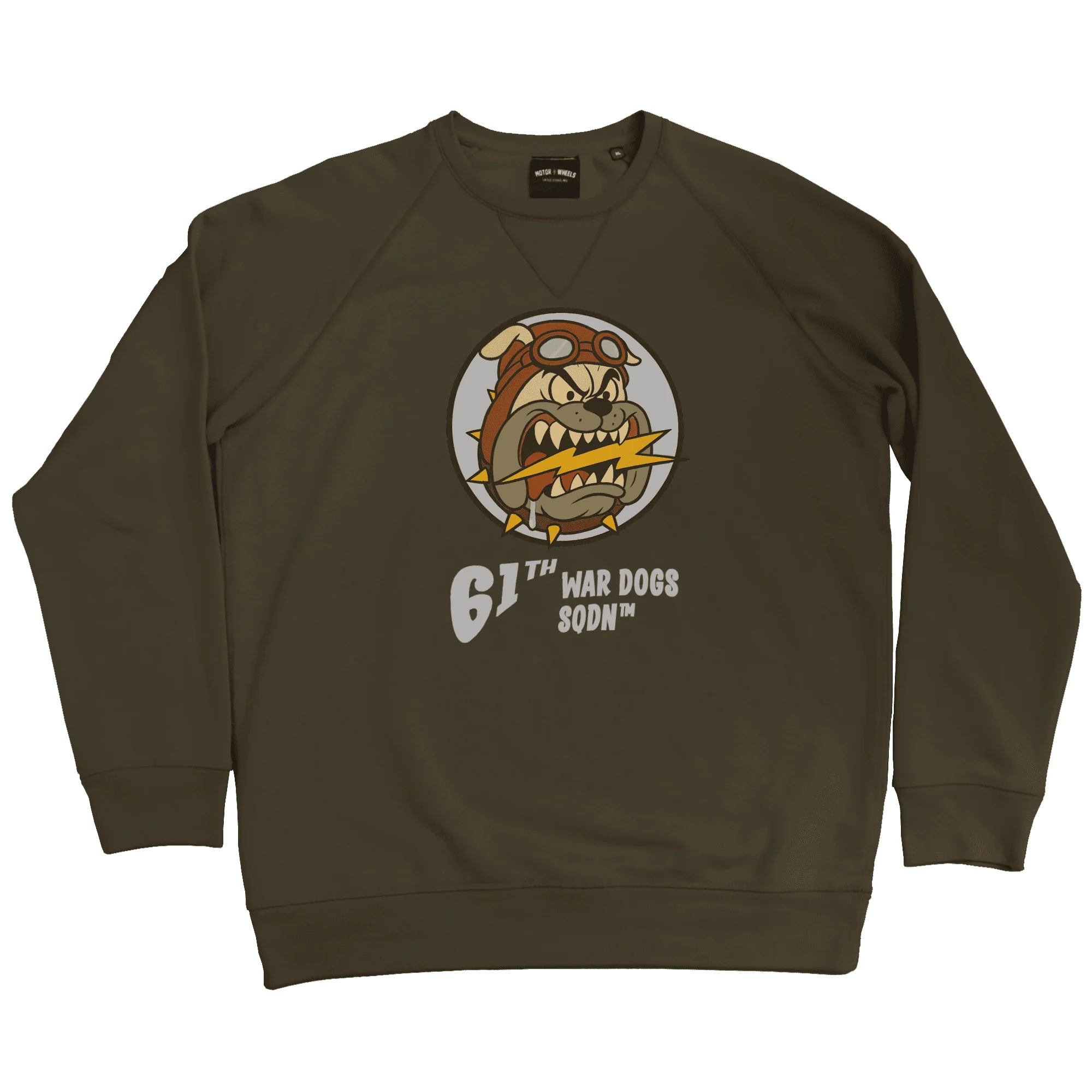 Le sweatshirt “War Dogs Squadron 61 – 1940 Edition” reprend cet héritage militaire avec un visuel marquant : un bulldog aviateur, lunettes sur le front, prêt à mordre et à foncer dans la mêlée. Un design typique de l’esprit WW2, symbole de courage, d’endurance et d’identité d’escadron.