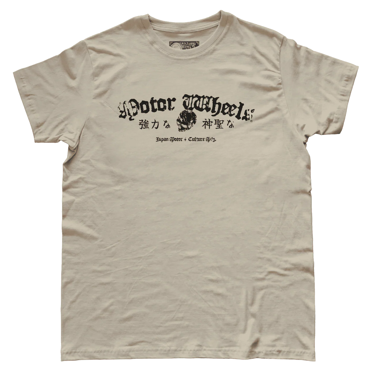 Sur la poitrine, un lettrage travaillé Motor Wheels se déploie en typographie gothique, accompagné d’un crâne central qui symbolise force, rébellion et immortalité. Deux inscriptions en kanji apportent une dimension sacrée au design, renforçant l’alliance entre puissance brute et spiritualité.