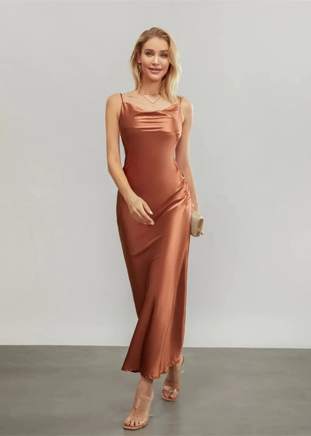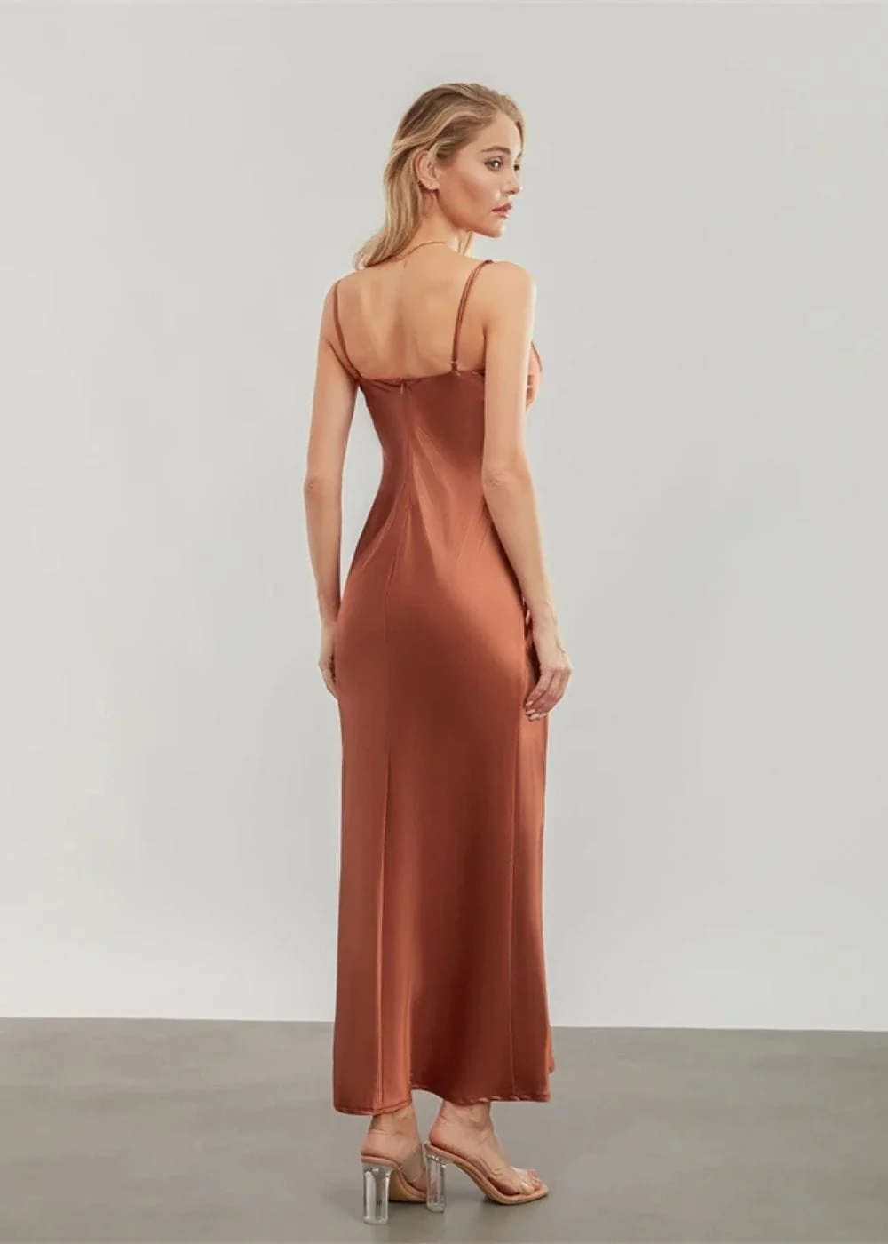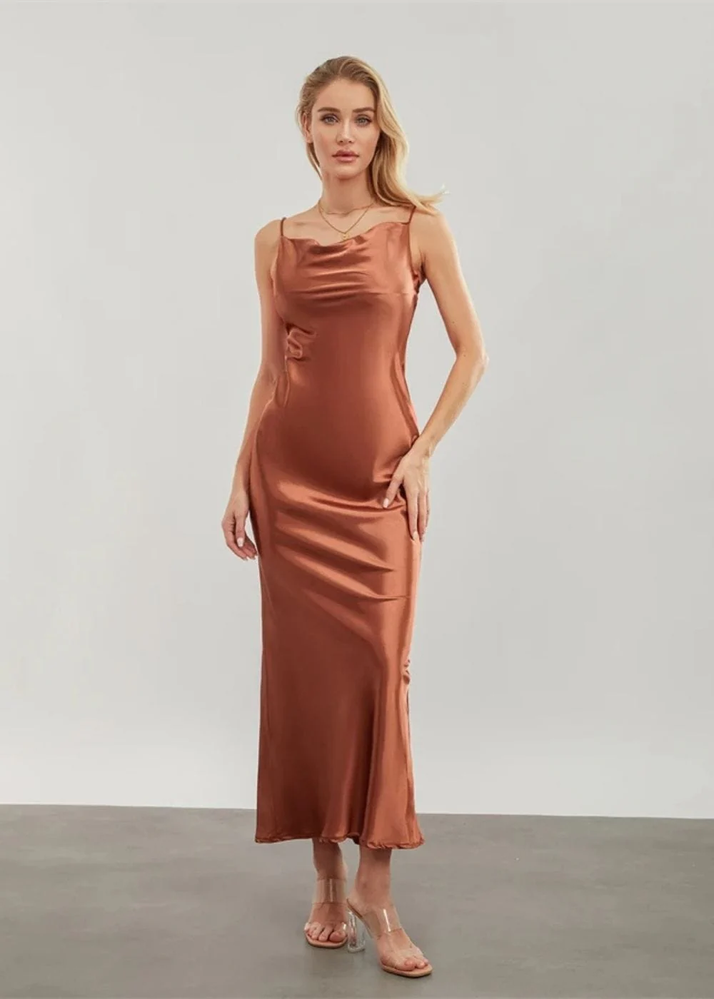 La couleur terracotta, à la fois chaleureuse et sophistiquée, illumine instantanément ton teint et se combine à merveille avec des accessoires en or ou en bois pour un contraste naturel. Les fines bretelles apportent une touche délicate, et l’encolure drapée ajoute juste ce qu’il faut de finesse pour une soirée où tu veux briller.