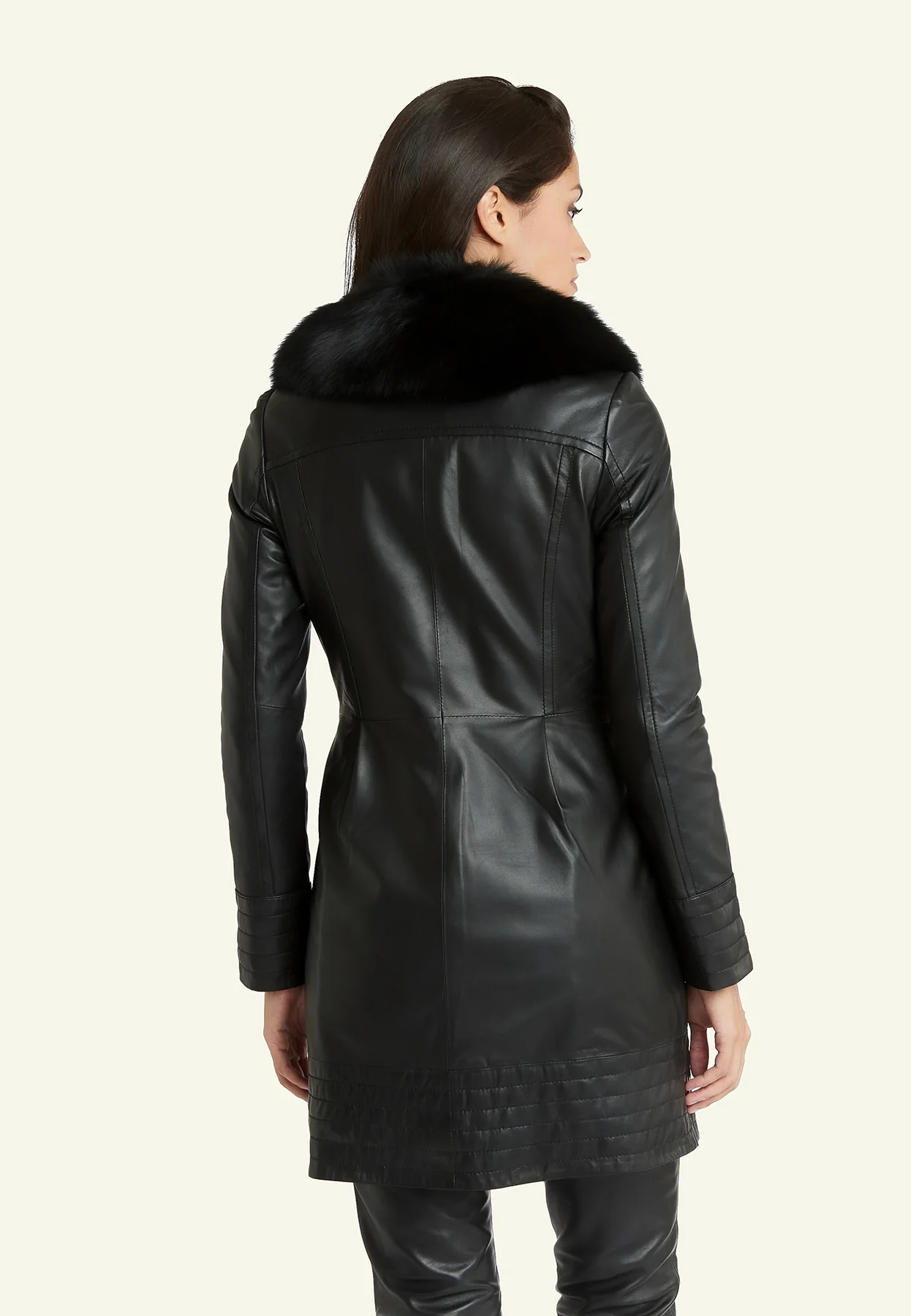 Craquez pour le sublime manteau Totti brown en très jolie qualité de cuir de mouton, son côté élégant et cintré sublimera votre silhouette. Son petit plus son col en renard détachable, que vous puissiez le porter de manière plus habillée ou décontracté