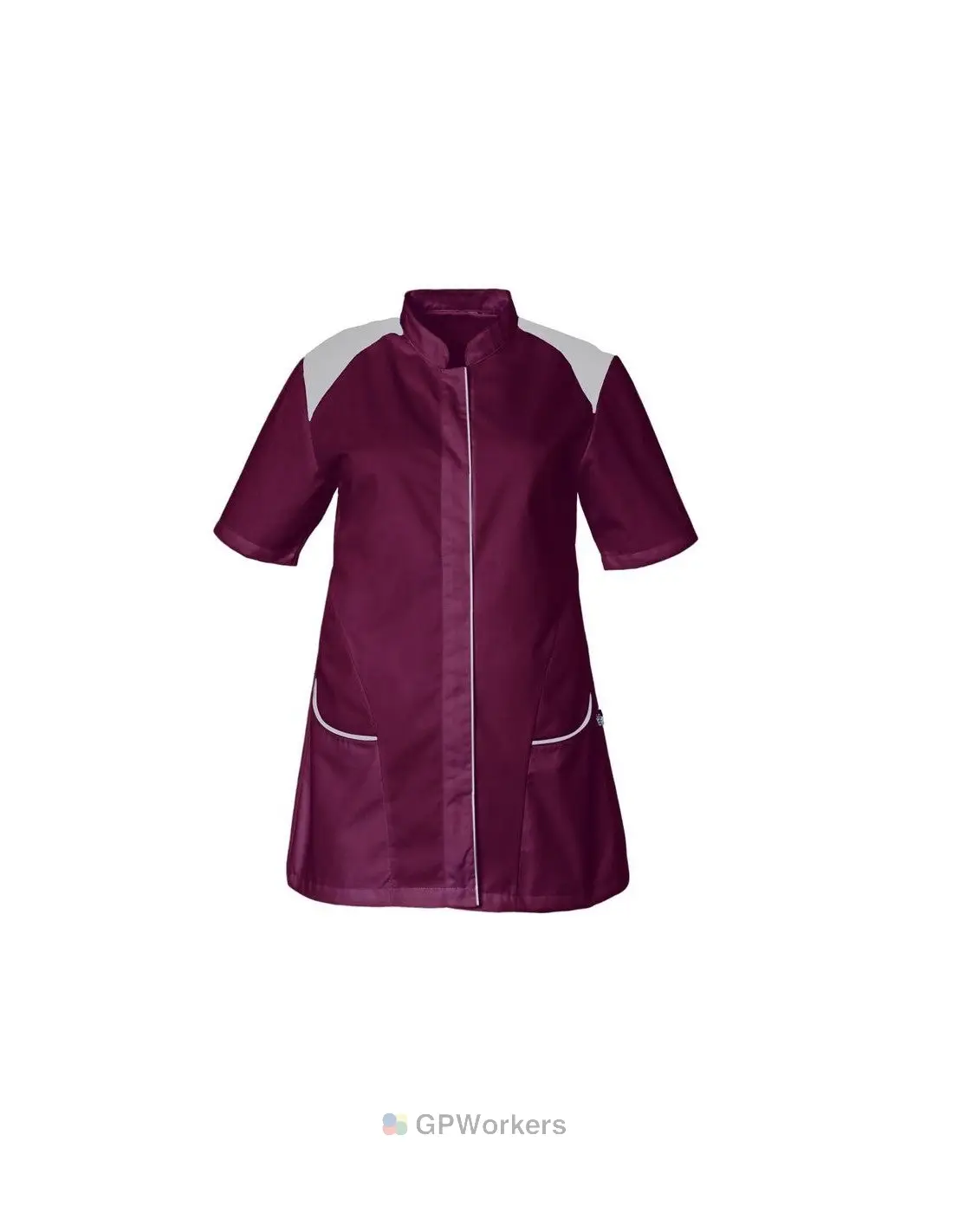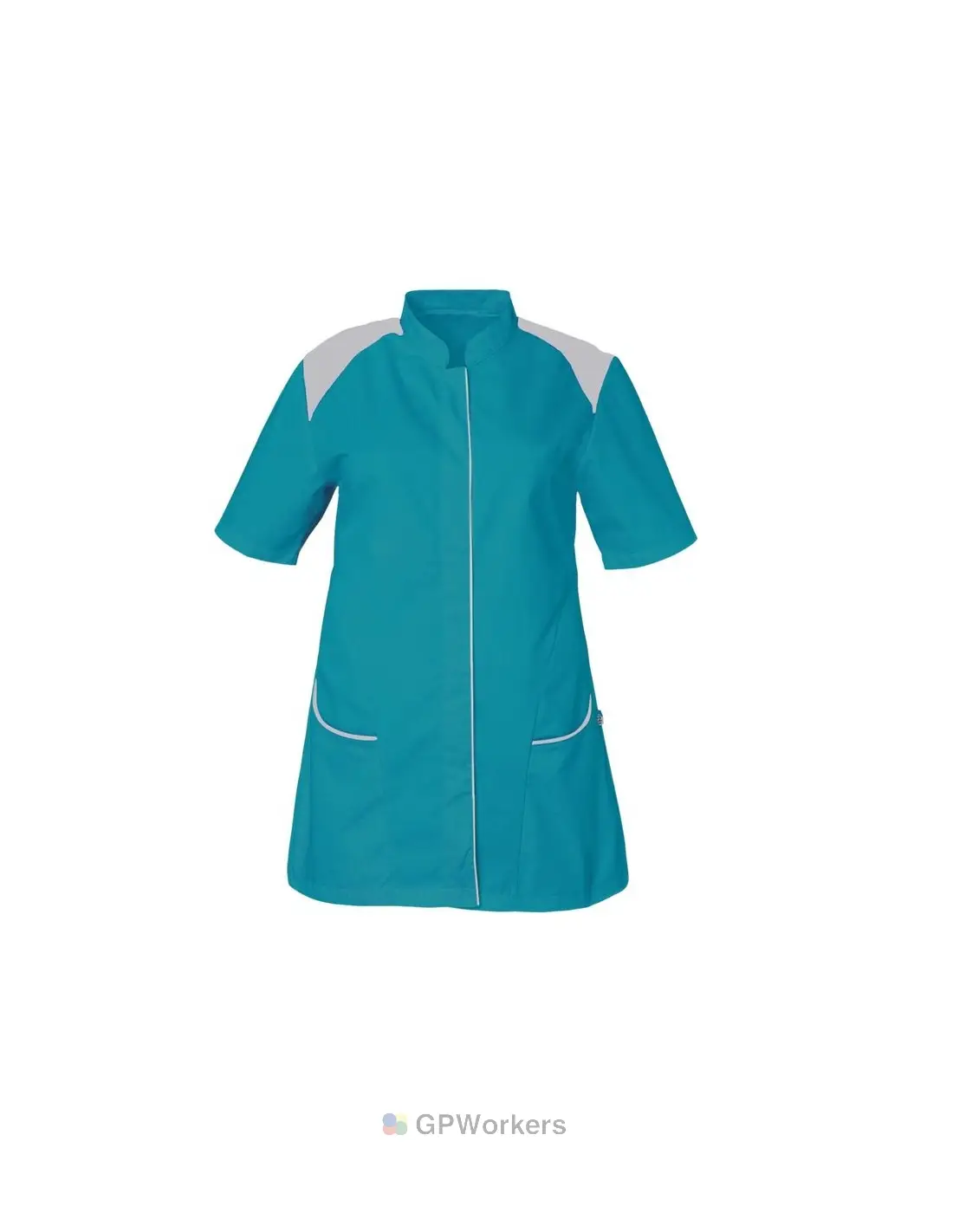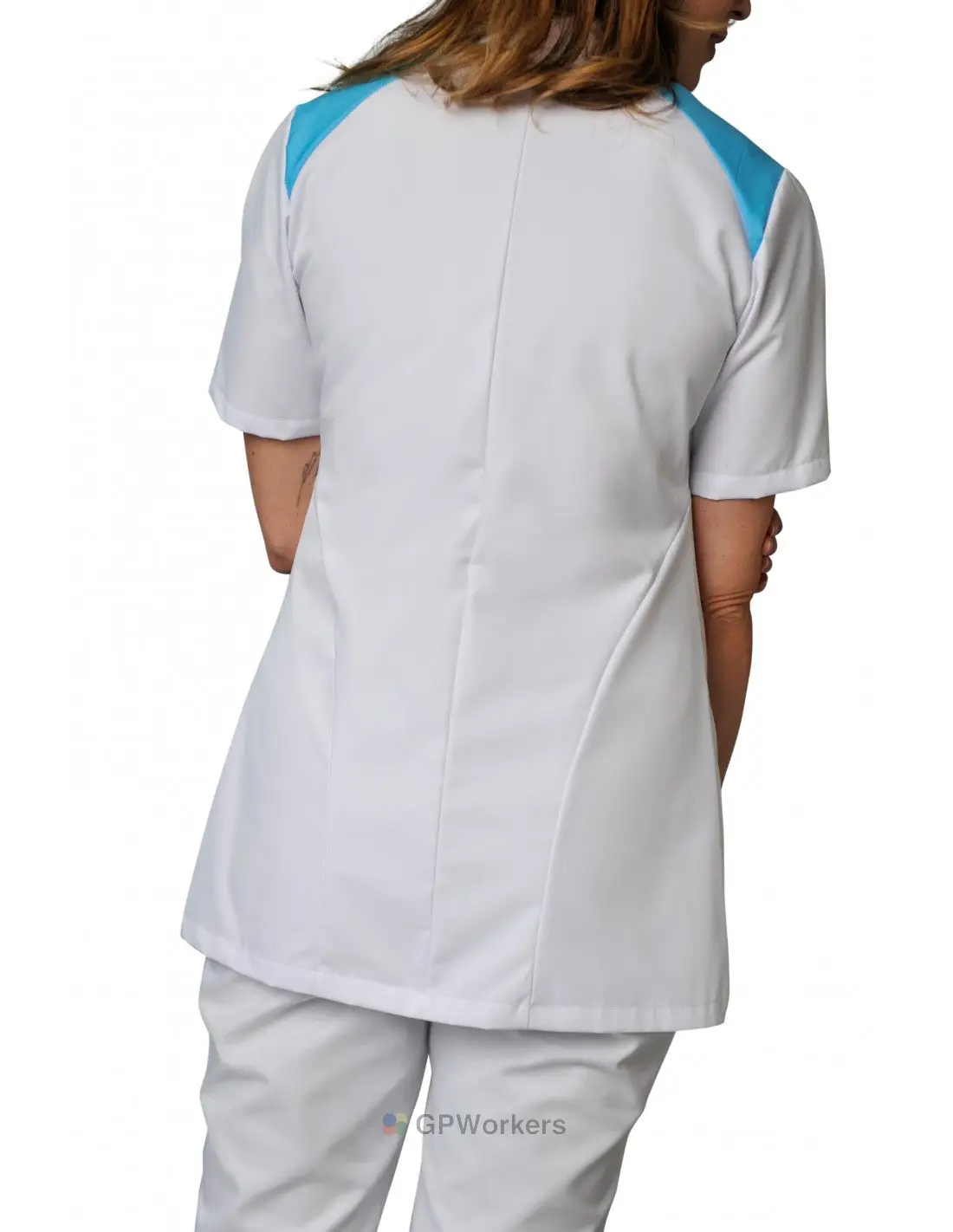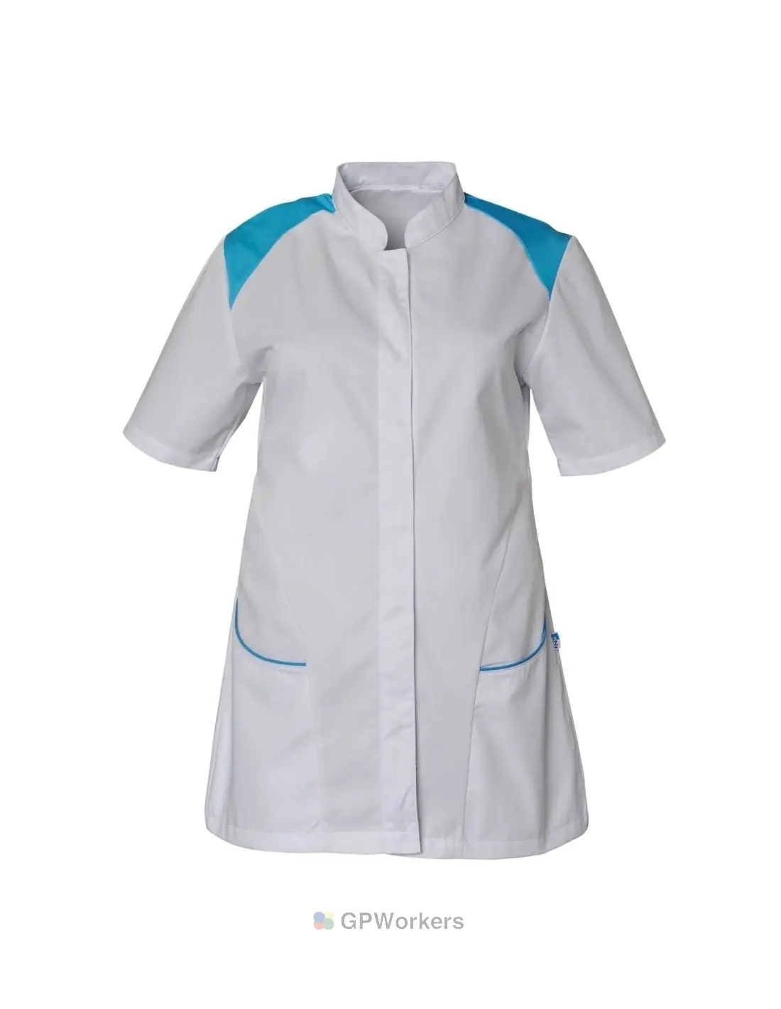 Nouveau, tissu blanc compatible lavage industriel • Col officier • Manches courtes • 5 pressions cachées • Coupe ajustée • Découpe fantaisie devant et dos • Hauteur dos : 75cm • Taille 0 à 6 • Polyester 65% coton 35% • 200 g/m² • coupe ajustée