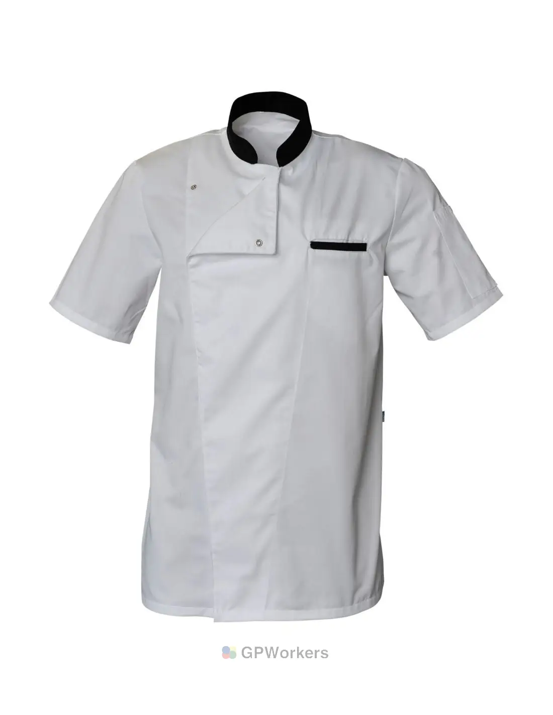 Veste manches courtes • col noir • Pressions sous patte • Poche coeur passepoilée noir • Poche stylo sur bras • Taille 0 à 6 • Coton/poly 50/50 210g