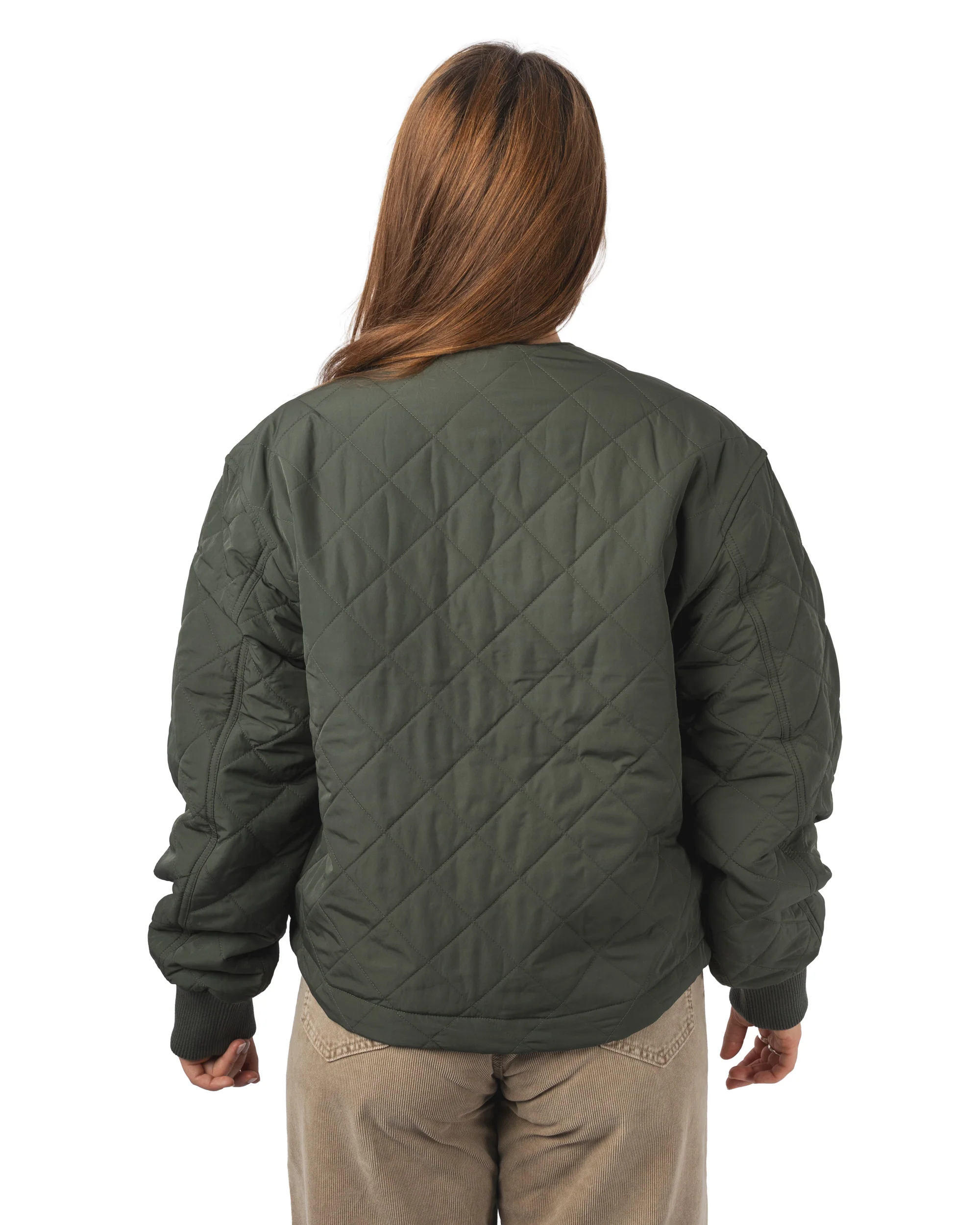 Le W’ Elma Liner illustre cette approche avec une veste légère matelassée. Confectionnée en tissu résistant et doublée pour apporter confort et chaleur, elle présente une coupe droite et polyvalente. Les poches plaquées, la fermeture boutonnée et les finitions soignées renforcent son aspect fonctionnel. Le logo Carhartt WIP discret signe la pièce avec authenticité.
